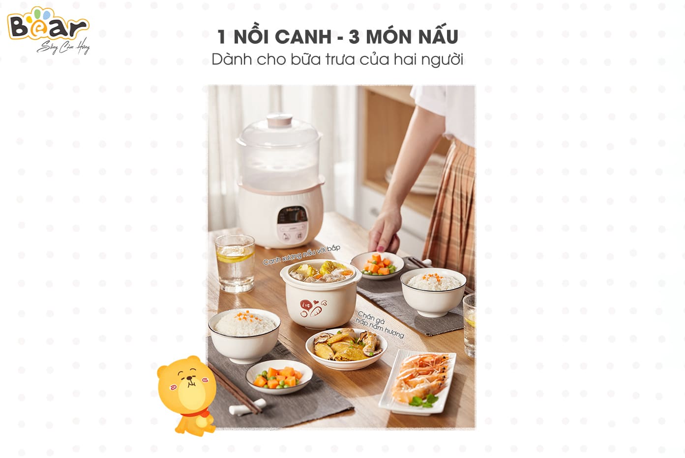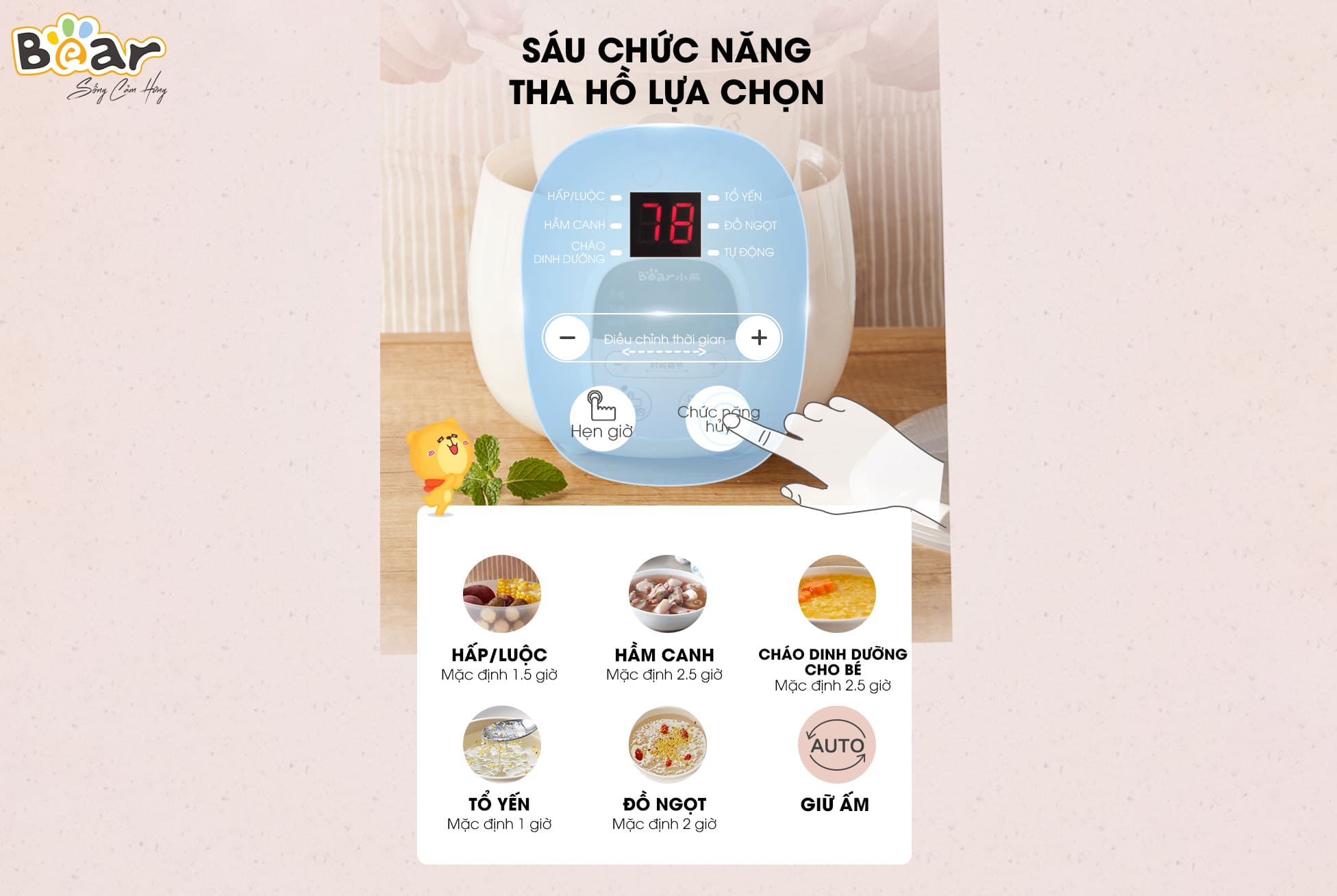 Sở hữu thiết kế thông minh nồi hầm đa năng Bear DDZ-B08C1 (SUBE001)cho phép người dùng làm nhiều món ăn khác nhau như: nấu cháo, làm món hầm,món hấp, ủ thức ăn, nấu canh, Đặc biệt, lõi nồi được làm bằng gốm cao cấp giúp giữ nhiệt lâu hơn, đảm bảo an toàn vệ sinh hơn các loại lõi nồi thông thường khác.