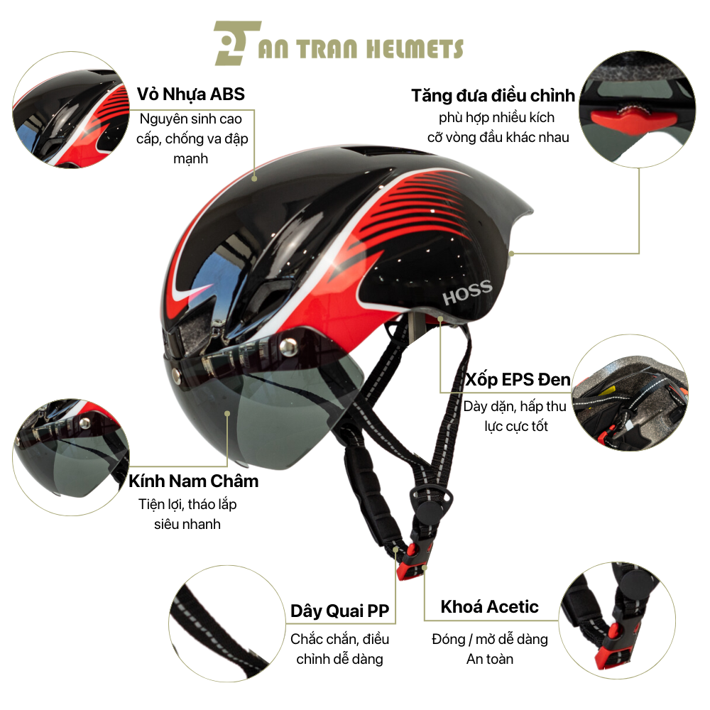 Nón Bảo Hiểm Thể Thao HOSS ATB31 Siêu Nhẹ Chống Nước, kính hít nam châm tăng đưa chỉnh size cho Nam Nữ THÔNG TIN CHI TIẾT: - Size: Free size - Kích thước: Chu vi vòng đầu: 54-62cm - Cân nặng: 300gr +-50gr - Màu sắc: Đen Bóng - Lót mũ: có thể tháo rời, tiện thay thế - Chất liệu: Nhựa ABS, Mút xốp EPS, Dây quai PP, Khóa Acetic - Kiểu nón: Nón nửa đầu, có kính - Bảo hành: 3 tháng (quai, dây) MÔ TẢ SẢN PHẨM: Mũ bảo hiểm xe đạp ATB31 là dòng sản phẩm mũ bảo hiểm xe đạp có kính dành cho người lớn. Với thiết kế khoa học, thoáng khí, trọng lượng nhẹ. Mũ được dùng khi đi xe đạp, chơi các hoạt động thể thao ngoài trời. Vỏ ngoài cùng bằng nhựa ABS, lớp xốp bên trong làm từ hạt xốp EPS thân thiện môi trường, Lớp đệm lót trong cùng tạo cảm giác êm ái và thoải mái khi đội Thiết kế thời trang, năng động và khí động học thân mũ có nhiều lỗ thông hơi đảm bảo thoải mái khi sử dụng Lót nón mềm mại đem lại sự êm ái khi sử dụng, dễ dàng tháo lắp, vệ sinh và thay thế. Dây quai đeo nón được làm hoàn toàn từ sợi dây dù cao cấp có thể điều chỉnh linh hoạt, khóa nón chắc chắn dễ dàng đóng mở, chất liệu bền bỉ chắc chắn. Kèm theo tăng đưa điều chỉnh chu vi vòng đầu cho phù hợp với người đội. Mũ được trang bị kèm một kính râm giúp tránh gió tránh bụi rất tốt, chống chói và mỏi mắt khi đi trời nắng. Kính được liên kết với mũ bằng 3 điểm nam châm cực mạnh, có thể dễ dàng tháo ra hoặc lắp vào đơn giản.