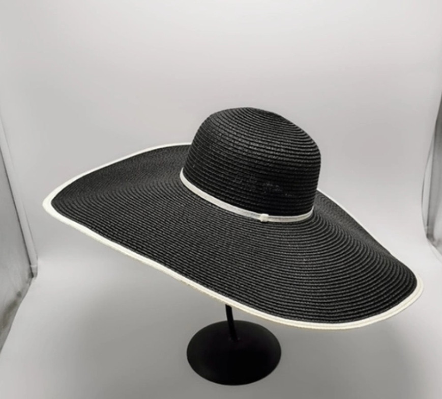 Nón đi biển mũ rộng vành chống nắng viền sọc phối đai ngọc trai nhân tạo 2 hoa trắng đen thời trang Hàn Quốc Chất liệu cói Kiểu dáng vành rộng Nón đi biển mũ