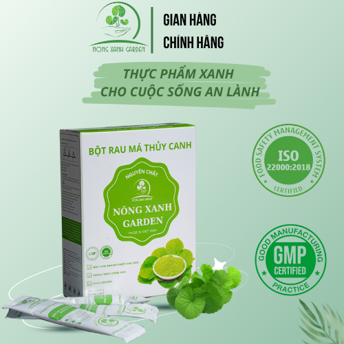 Mua tại TiktokHộp Bột Rau Má Thủy Canh Nguyên Chất Nông Xanh Garden 45GR Thực phẩm bổ sung Bột rau má với thành phần từ Rau má thủy canh tươi sau khi thu hoạch được làm sạch bằng phương pháp sục Ozone. Sau đó, kết hợp kỹ thuật sấy lạnh với công nghệ nghiền cối đá siêu mịn từ Nhật Bản nên giữ nguyên vẹn được giá trị dinh dưỡng, hương vị, màu sắc của rau má thủy canh nguyên chất.