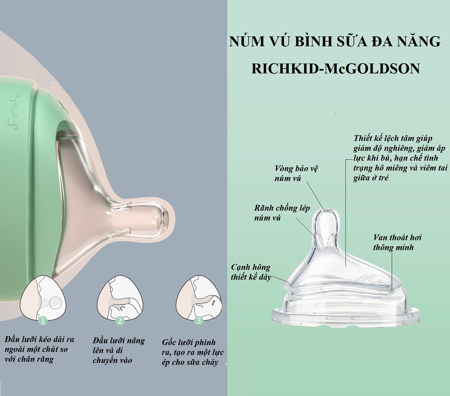 - Núm vú phẳng, tròn và có kích thước phù hợp với nhu động bú và phát triển miệng của trẻ, không gây hô miệng khi sử dụng núm vú nhân tạo trong thời gian  dài.      - Với thiết kế đặc biệt mô phỏng theo hình thái học của vú mẹ với phần giữa của núm bị thu hẹp và gốc mở rộng giúp ổn định vị trí khi ngậm.      - Đường kính núm vú rộng, hình dạng và độ dài hoàn toàn giống vú mẹ với vẻ ngoài đơn giản và đường cong mượt mà, khiến bé yêu mẹ hơn và thoải mái khi bú.      - Độ dày: Về tổng thể, núm vú dày vừa đủ để núm vú đảm bảo tính mềm mại tự nhiên, ngoài ra phần gốc dưới được làm dày hơn để không dễ bị xẹp, tăng độ bền và thoải mái hơn trong quá trình bú.      - Chất liệu: Silicone mềm mại, thoải mái, thân thiện với là da, giống như bú mẹ tự nhiên và bé dễ dàng chấp nhận.      - Vòng bảo vệ: Bên ngoài lỗ núm vú có vòng bảo vệ giúp duy trì kích thước ban đầu của lỗ núm vú, tạo dòng chảy sữa ổn định và bảo vệ núm vú khi bị bé cắn.      - Thành trong của cổ núm vú được thiết kế có rãnh chông lép. Khi bé cắn núm vú, sữa vẫn có thể chảy ra từ đường nối bên của rãnh. Bé vẫn bú dù cố tình ngậm hay cắn núm.      - Thiết kế lệch tâm: Núm vú được thiết lệch tâm tạo thành một góc nhất định với bình bú giúp sữa có thể chảy từ bình vào miệng rồi xuống cổ họng một cách thuận lợi. Điều này giúp sữa được nuốt tự nhiên và tránh sặc hiệu quả vì đưa sữa trực tiếp vào gốc lưỡi và cổ họng.      - Núm vú lệch tâm cần độ dốc thấp, bé không cần ngửa đầu, chúc bình sữa lên cao gây mỏi tay bé, ngoài ra không chúc bình cao giúp bé không bị bình sữa che mắt, có thể quan sát mẹ và cảnh vật xung quanh, tăng cường kết nối.      - Núm vú lệch tâm tạo độ dốc thấp, có thể ngăn sữa vào tai giữa qua ống tai một cách hiệu quả, giảm áp lực lên khoang tai của bé và ngăn ngừa các bệnh về tai.      - Thiết kế chống đầy hơi: Với van thoát hơi thông minh giúp thoát khí chống đầy hơi có thể cân bằng hiệu quả áp suất trong bình đồng thời giảm lượng không khí đi vào bình sữa. Điều này làm giảm nấc cụt, nôn trớ và các triệu chứng khó chịu khác của bé do nuốt phải không khí gây đầy hơi.