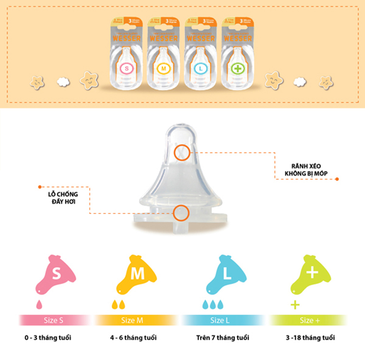 - Với thiết kế dựa trên quá trình nhiều năm quan sát và nghiên cứu cử động bú mẹ của bé, núm ty silicon vừa giúp bé bú sữa dễ dàng, vừa hỗ trợ cho sự phát triển tự nhiên của cơ hàm, răng và cấu trúc xương. Sản phẩm của thương hiệu Wesser gắn liền với các sản phẩm chăm sóc cho bé từ những ngày tháng đầu đời.