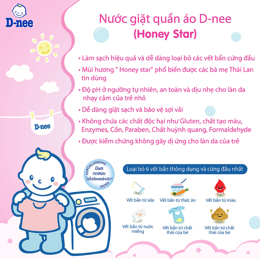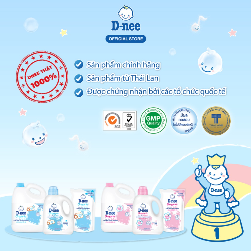 Dung Dịch Giặt Quần Áo Cho Bé D-Nee - Chai 960ml (Hồng) giúp làm sạch quần áo em bé nhờ công thức đặc biệt giúp thổi bay vết bẩn hiệu quả. Nước giặt D-nee với độ pH trung tính không làm tổn thương da tay mẹ cũng như làm hại đến quần áo bé. Không những thể, hương thơm nhẹ nhàng còn lưu lại suốt trên quần áo, giúp bé thơm tho suốt ngày dài.