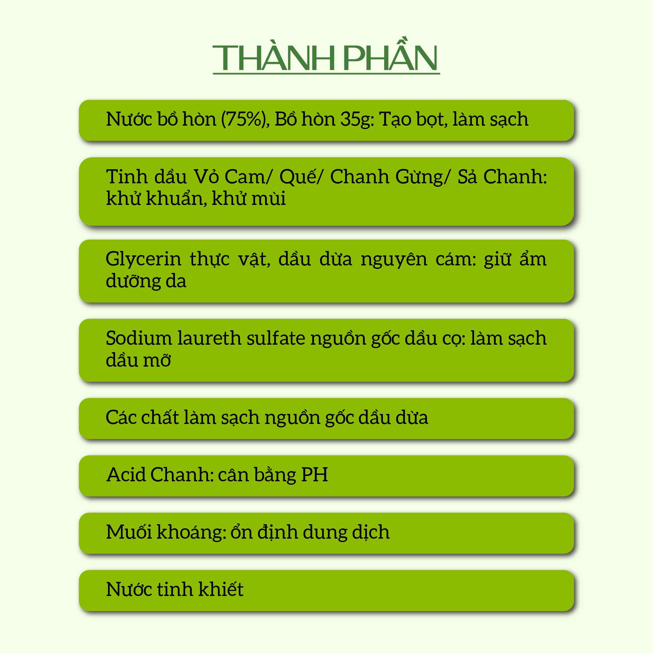 Thành phần: - Nước bồ hòn (75%) + Bồ hòn 35g (Tạo bọt và làm sạch) - Tinh dầu tự nhiên khử khuẩn, khử mùi (Sả Chanh/Quế/Cam/Chanh Gừng): 7g - Glycerin thực vật, dầu dừa nguyên cám (giữ ẩm dưỡng da). - Sodium laureth sulfate nguồn gốc dầu cọ (làm sạch dầu mỡ). - Các chất làm sạch nguồn gốc dầu dừa. - Acid Chanh (cân bằng PH). Muối khoáng (ổn định dung dịch). Nước tinh khiết.