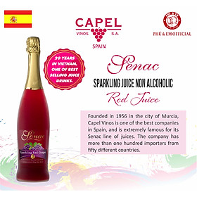 • Palate: The fresh and gentle red grape aromas on the palate with a medium body accompanied by a light bubbly sensation. These goods have gas, no alcohol and a sweet taste which is good for digestion and beauty.   Giải Thưởng/ Prizes: Đang cập nhật. Nhãn Hiệu/ Brand: Senac. Xuất Xứ/ Origin: Tây Ban Nha. Vùng/ Region: Murcia. Giống Nho/ Grape Variety: Nước nho cô đặc. Dung Tích/ Capacity: 750ml Nồng Độ/ ABV: 0%   Kết Hợp/ Pair Food: Thích hợp cho mọi món ăn, phù hợp với mọi thành viên trong gia đình, các sự kiện, bữa tiệc và các ngày Lễ. For every food, suitable for every member of the family, events, parties, Feast days and especially for congratulatory occasions need an exploded cap and gas foam.   Nhiệt Độ Ướp/ Ideal Temperature: 8-10°C