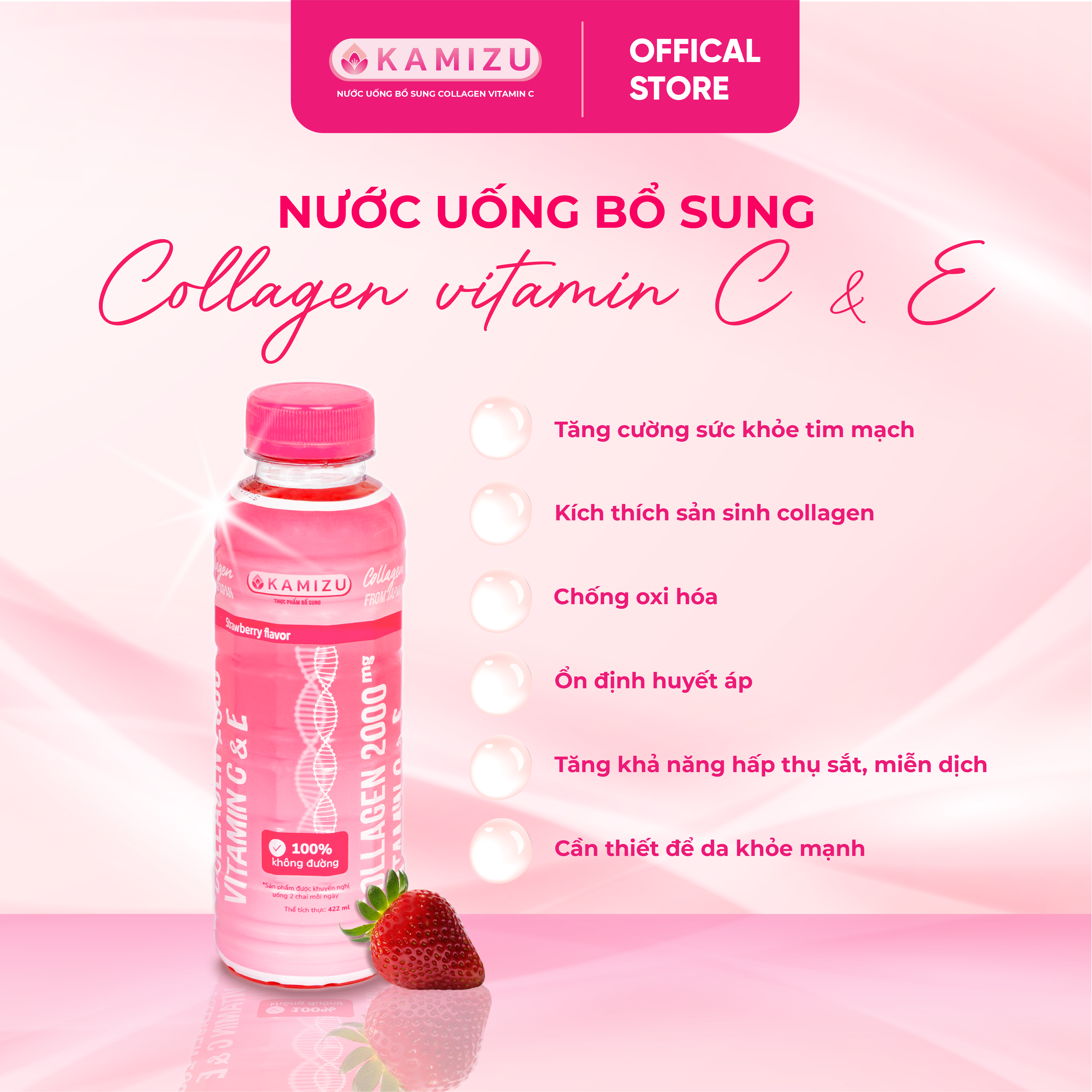 Nước uống bổ sung Kamizu Collagen Vitamin C & E Thành phần: Nước tinh khiết , Collagen fish, Vitamin C & E , hương liệu tổng hợp hương DÂU , chất tạo ngọt tổng hợp: