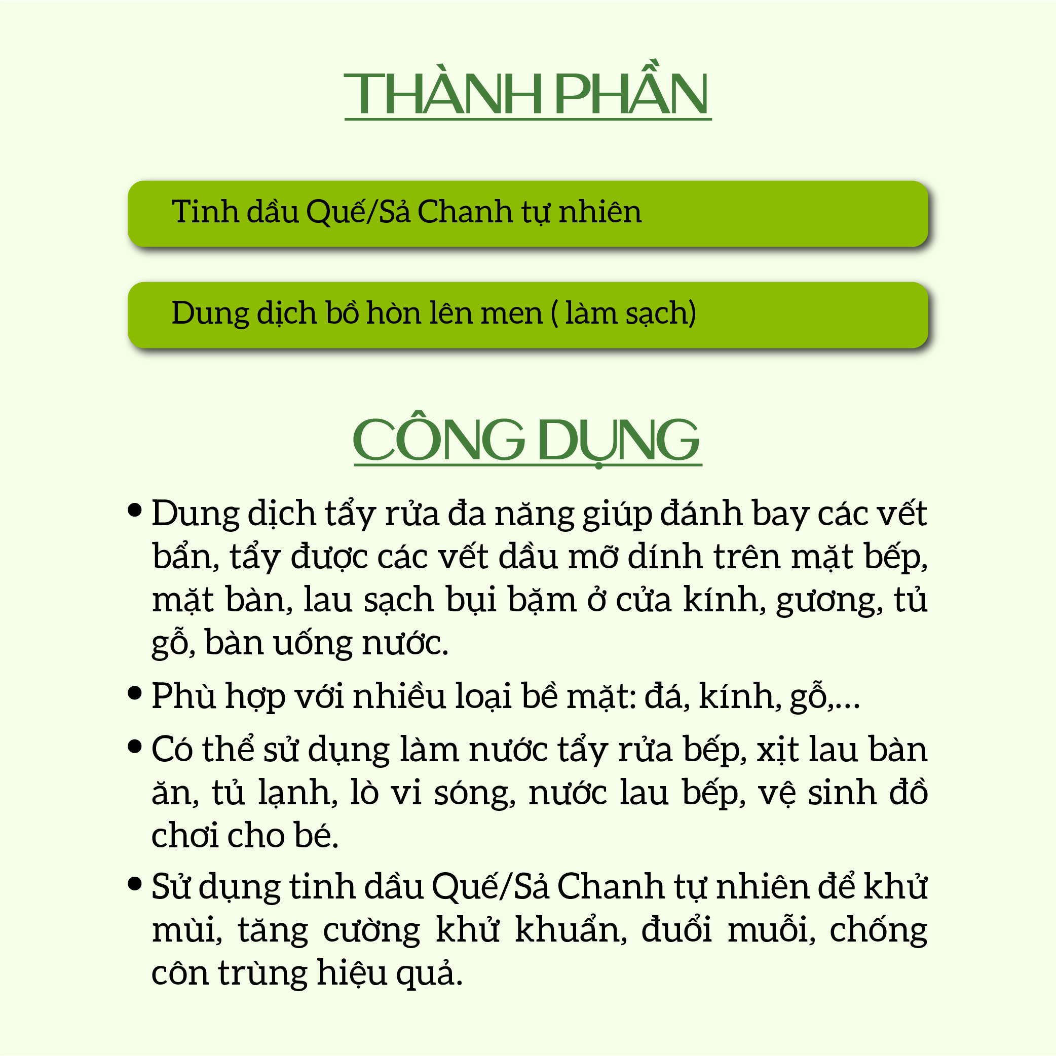 - 0% Hóa chất độc hại – Thành phần: Nước Bồ hòn lên men tự nhiên (tạo bọt và làm sạch), Tinh dầu Quế tự nhiên. Dung môi thiên nhiên, nước tinh khiết – Chỉ tiêu chất lượng: Không kích ứng da – Chú ý: Không để rơi mỡ, thức ăn vào lọ dung dịch hữu cơ để tránh ôi thiu. Không uống được. Tránh tiếp xúc trực tiếp với ánh nắng. Để xa tầm tay trẻ em. Chỉ mua sản phẩm và sử dụng khi lớp niêm phong còn nguyên vẹn.