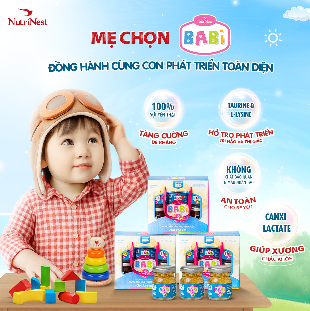 NutriNest Babi – sản phẩm nước yến cao cấp dành riêng cho trẻ em, với sợi yến mềm tự nhiên, vị ngọt thanh từ đường kiêng từ củ cải đường tự nhiên và hương Vani