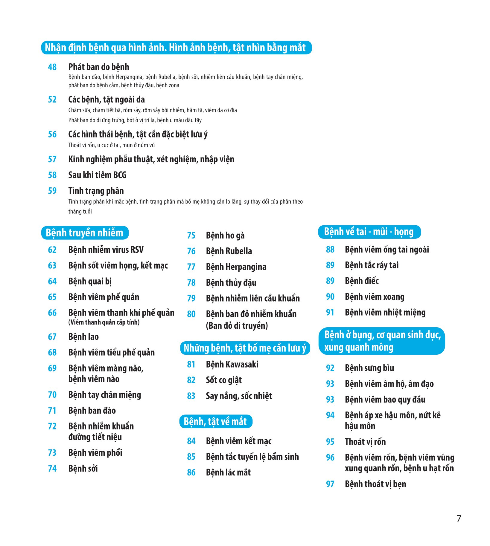 Các loại bệnh thường gặp: Sách chia sẻ về các bệnh về hô hấp, tiêu hóa, da liễu, thần kinh... thường gặp ở trẻ nhỏ, giúp bố mẹ nhận biết sớm các dấu hiệu bất thường.