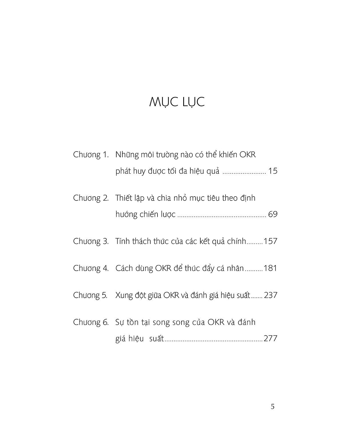 Cuốn sách cung cấp các khái niệm căn bản nhất về OKR, phù hợp cho những người mới tiếp cận và tìm hiểu về phương pháp quản lý này. Sách gồm 6 chương: