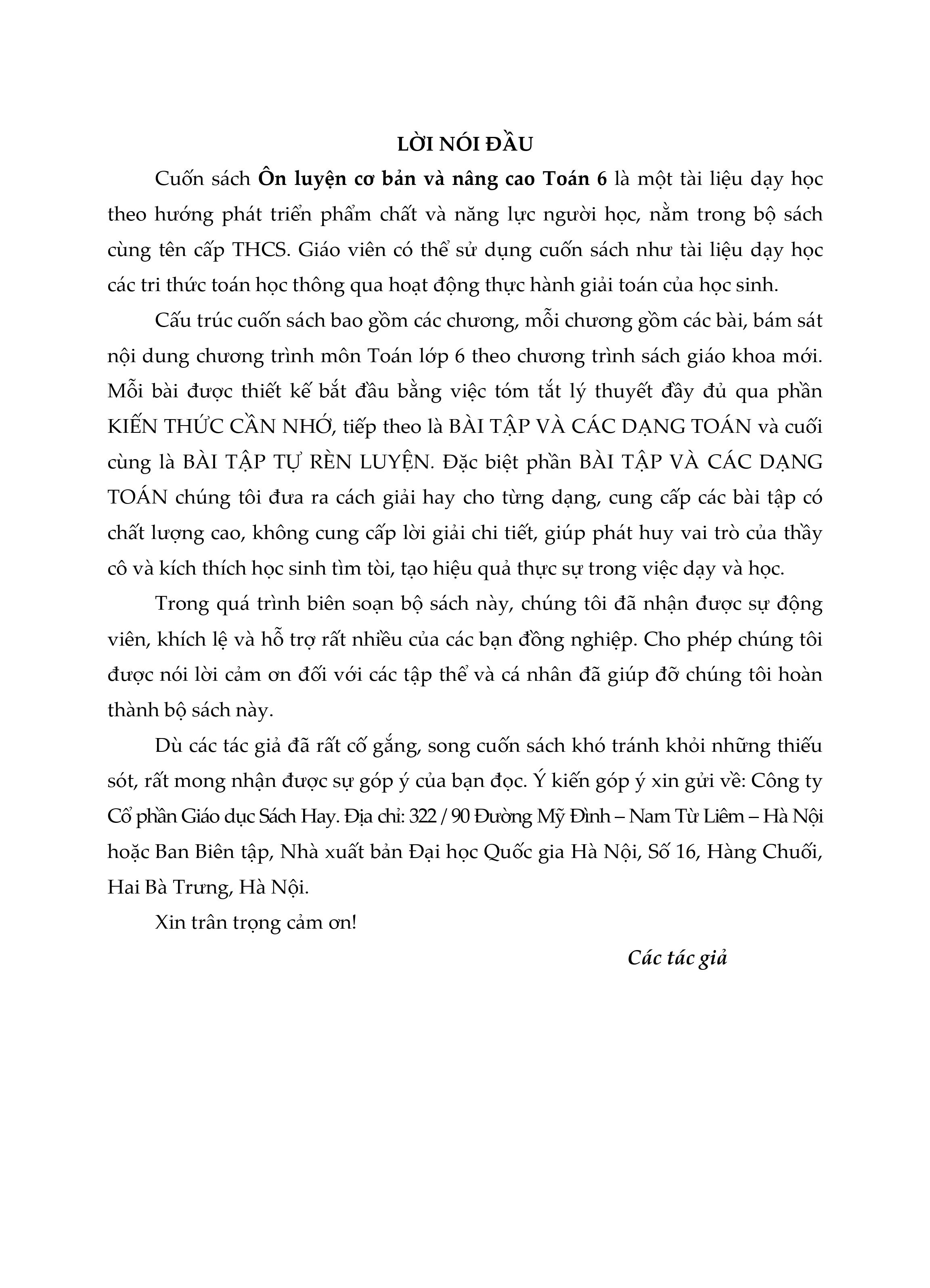 Tên sách: Ôn luyện Cơ bản và Nâng cao Tiếng Anh 6 (Tập 1) Tác giả: Nguyễn Thị Tuyền, Ngô Thị Hà, Đỗ Anh Thư Nhà xuất bản: NXB Đại học Quốc gia Hà Nội Khổ sách: 19 x 27 cm Số trang: 172 trang Giá bìa: 75.000 đồng Cuốn sách Ôn luyện cơ bản và nâng cao Toán 6 là một tài liệu dạy học theo hướng phát triển phẩm chất và năng lực người học, nằm trong bộ sách cùng tên cấp THCS. Giáoviên có thể sử dụng cuốn sách như tài liệu dạy học các tri thức toán học thông qua hoạt động thực hành giải toán của học sinh. Cấu trúc cuốn sách bao gồm các chương, mỗi chương gồm các bài, bám sát nội dung chương trình môn Toán lớp 6 theo chương trình sách giáo khoa mới. Mỗi bài được thiết kế bắt đầu bằng việc tóm tắt lý thuyết đầy đủ qua phần KIẾN THỨC CẦN NHỚ, tiếp theo là BÀI TẬP VÀ CÁC DẠNG TOÁN và cuối cùng là BÀI TẬP TỰ RÈN LUYỆN