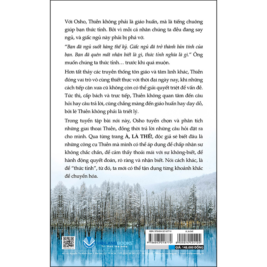 Trong tuyển tập bài nói này, Osho tuyển chọn và phân tích những giai thoại Thiền, đồng thời trả lời những câu hỏi đặt ra cho mình. Qua từng trang À, là thế!, độc giả sẽ biết đâu là những công cụ Thiền mà mình có thể áp dụng để chấp nhận sự không chắc chắn, để cảm thấy thoải mái với sự không-biết, để hành động quyết đoán, rõ ràng và nhận biết. Nói cách khác, là để “thức tỉnh”, từ đó, ta mới có thể tận dụng từng khoảnh khắc để chuyển hóa.