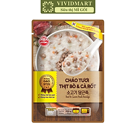 • THÙNG 20 GÓI   KHỐI LƯỢNG: Cháo tươi Ottogi vị Thịt bò & cà rốt: 220g/gói   HẠN SỬ DỤNG: 18 tháng kể từ ngày sản xuất   HƯỚNG DẪN SỬ DỤNG: Ngon hơn khi dùng nóng với các cách sau: Cách 1: Mở gói, cho sản phẩm vào tô, hâm nóng trong lò vi sóng (800W) 1 phút 30 giây Cách 2: Cho sản phẩm còn nguyên bao bì vào nước nóng khoảng 7 phút hoặc nấu trên bếp khoảng 3 phút.   THÀNH PHẦN: Chi tiết xem trên bao bì   HƯỚNG DẪN BẢO QUẢN: Bảo quản nơi khô ráo, thoáng mát, tránh ánh nắng trực tiếp. Không để gần hóa chất hoặc sản phẩm có mùi mạnh