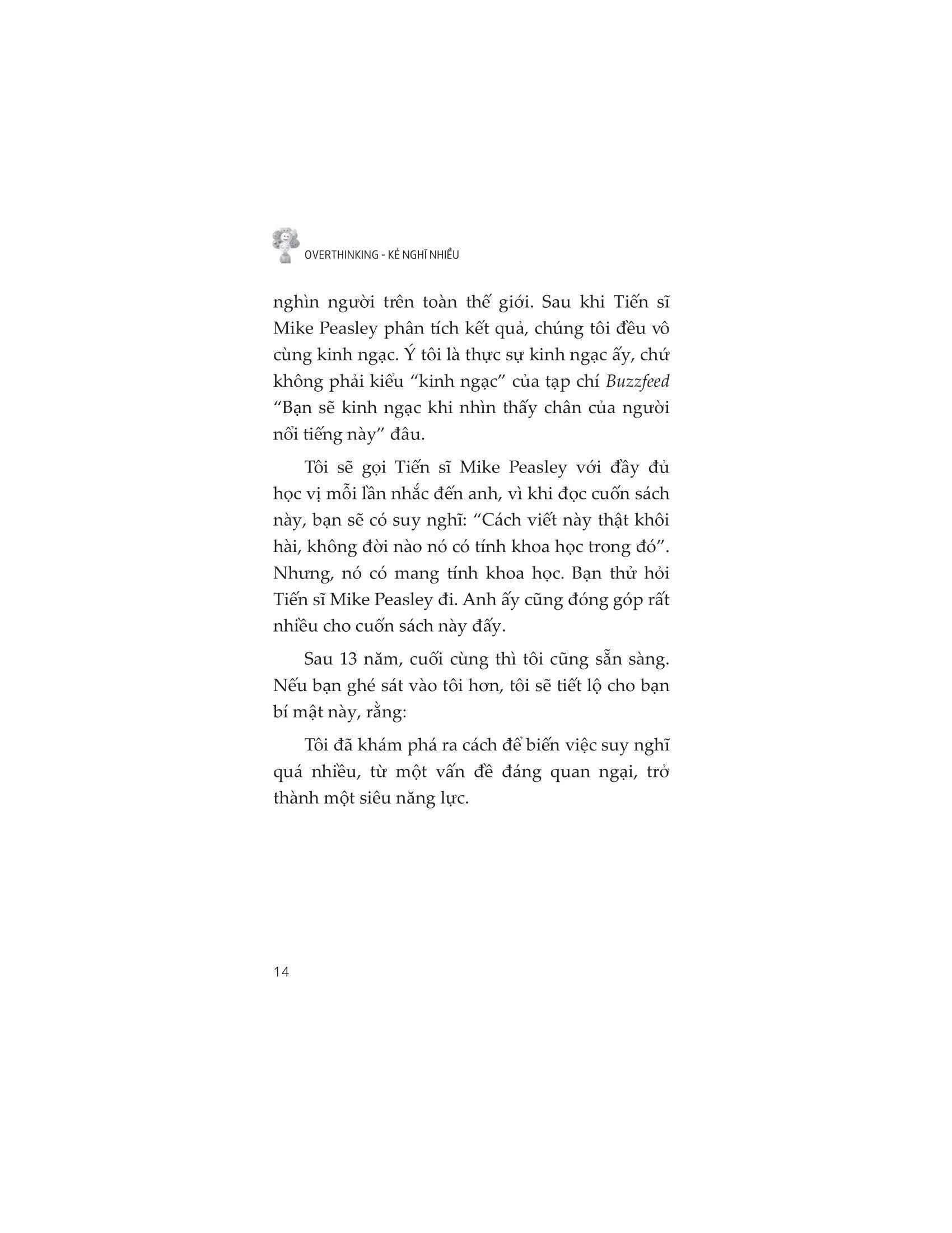 Với cuốn sách “Overthinking – Kẻ nghĩ nhiều”, bạn sẽ học được cách biến những suy nghĩ của m.ình thành hành động. Bạn có thể tận dụng thời gian, công sức và sự sáng tạo có thể tái tạo để tạo ra cuộc sống mà bạn muốn. Và nó bắt đầu bằng việc nhận ra bản chất của những suy nghĩ – là một bài hát của cuộc đời m.ình.
