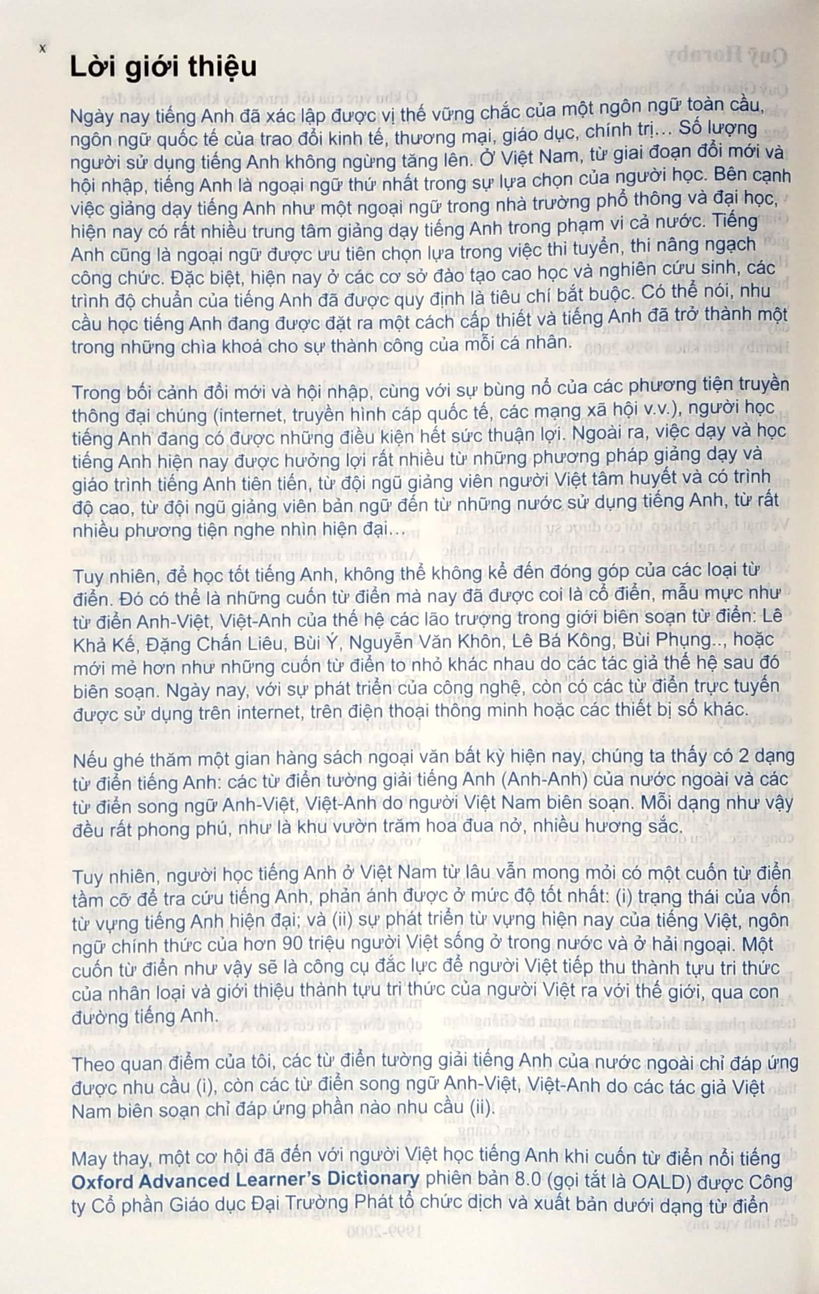 It took 4 years for the experts working on the Vietnamese part of the Bilingual Edition English-English-Vietnamese of Oxford Advanced Learner’s Dictionary 8th Editionto compile and deliver the essences of the dictionary. The Vietnamese part has confirmed the capability of modern Vietnamese. This is a national level research project that tells the world the achievement of Vietnamese through English. The Bilingual Edition English-English-Vietnamese of Oxford Advanced Learner’s Dictionary 8th Edition, with exceptional features, will be a brilliant companion for Vietnamese learners to learn English and achieve desired goals in their lives.