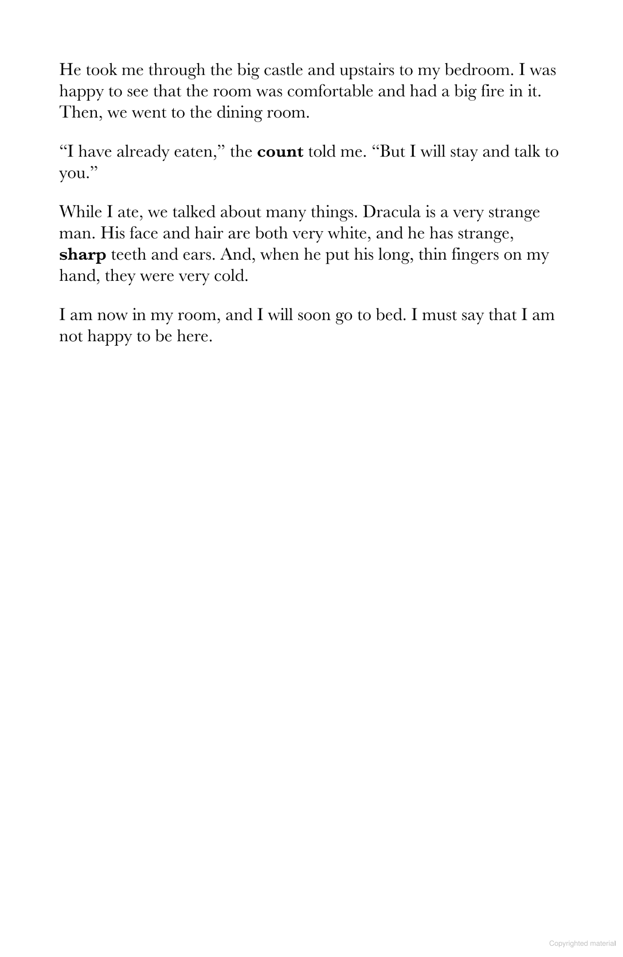 Dracula, a Level 3 Reader, is A2 in the CEFR framework. The text is made up of sentences with up to three clauses, introducing first conditional, past continuous and present perfect simple for general experience. It is well supported by illustrations, which appear on most pages.