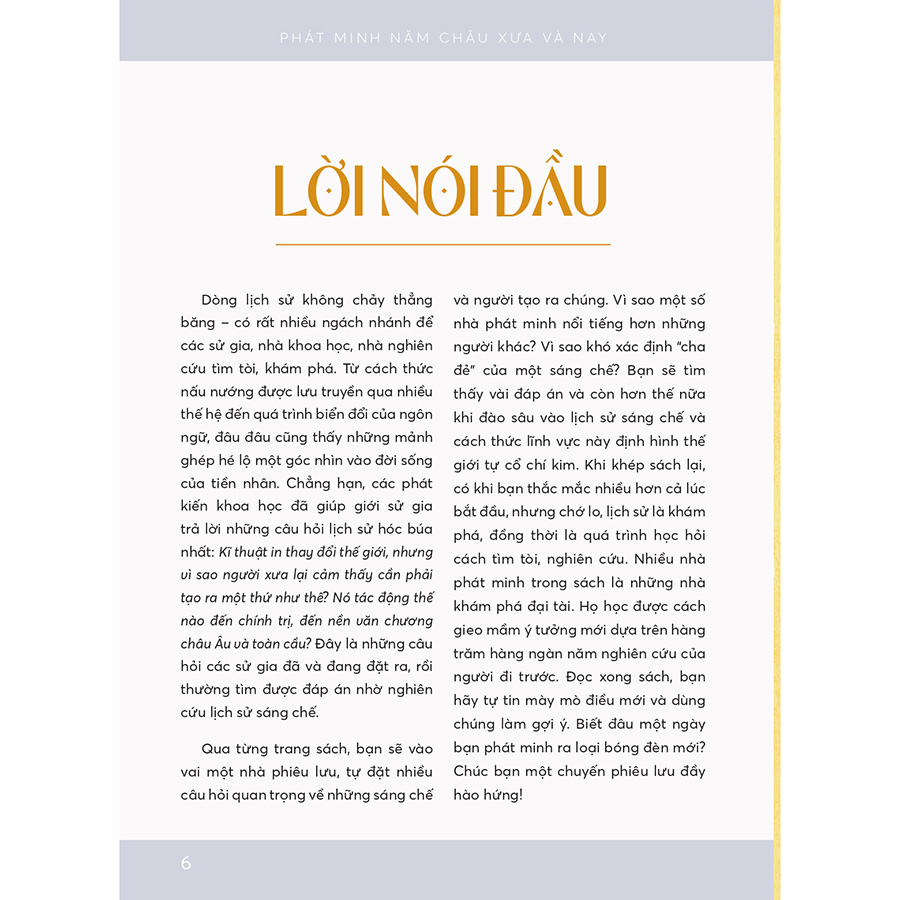 Tại sao vài nhà phát minh nổi tiếng hơn những người khác? Vì đâu khó xác định “cha đẻ” của một sáng chế? Kĩ thuật in thay đổi thế giới, nhưng do nguyên cớ gì mà người xưa cảm thấy cần phải tạo ra nó? Khi đào sâu tìm hiểu lịch sử sáng chế và cách thức lĩnh vực này định hình thế giới tự cổ chí kim, bạn sẽ thấy đáp án cho những câu hỏi trên, và còn hơn thế nữa.