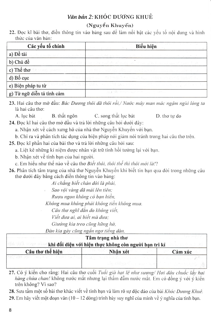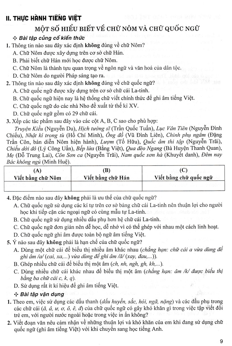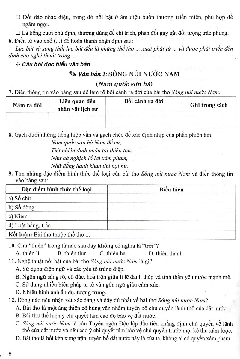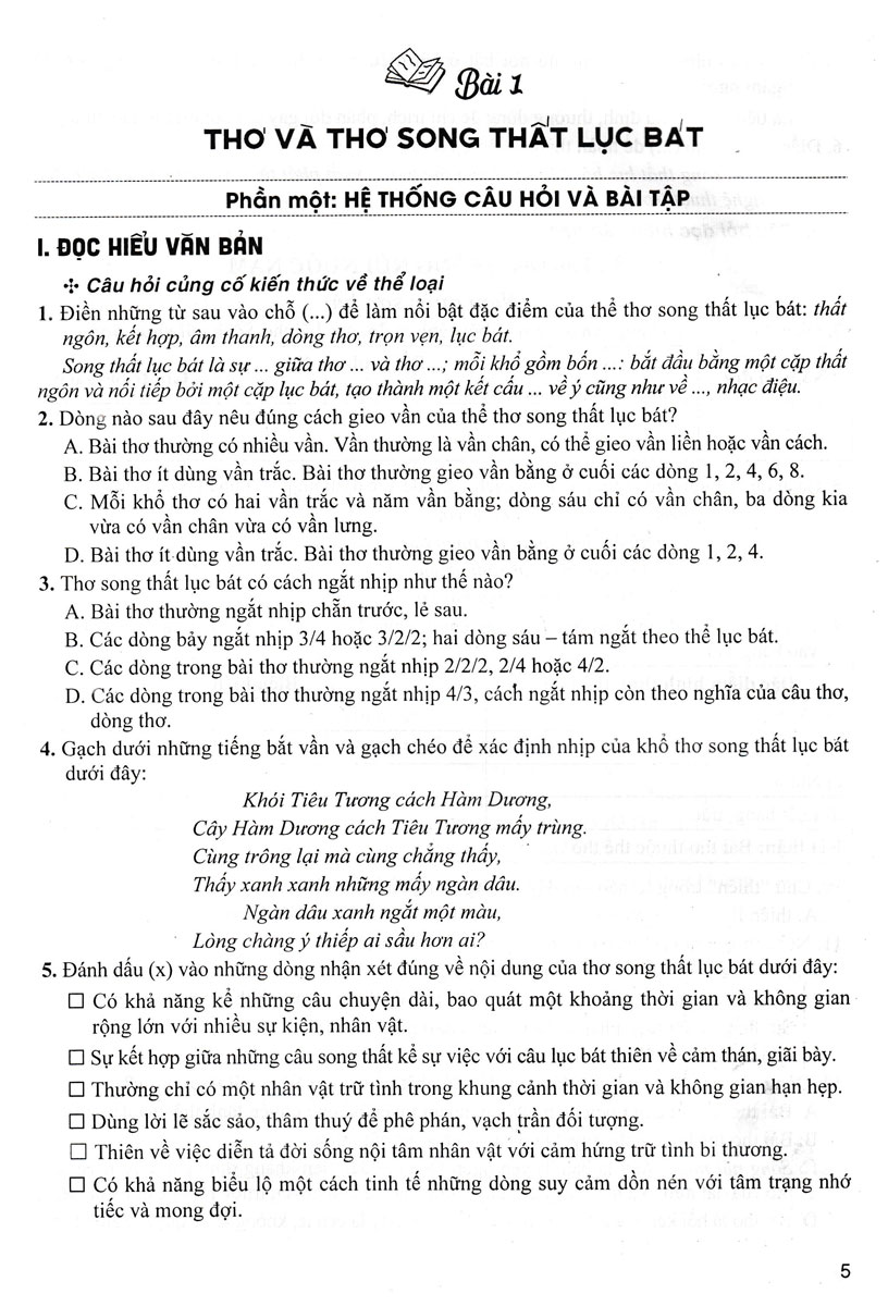 • Đọc hiểu văn bản: Với hệ thống câu hỏi không trùng với câu hỏi của sách giáo khoa được chia thành câu hỏi củng cố kiến thức về thể loại/ kiểu văn bản và câu hỏi đọc hiểu văn bản ở các mức độ nhận biết, thông hiểu, vận dụng.
