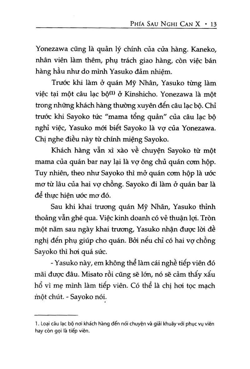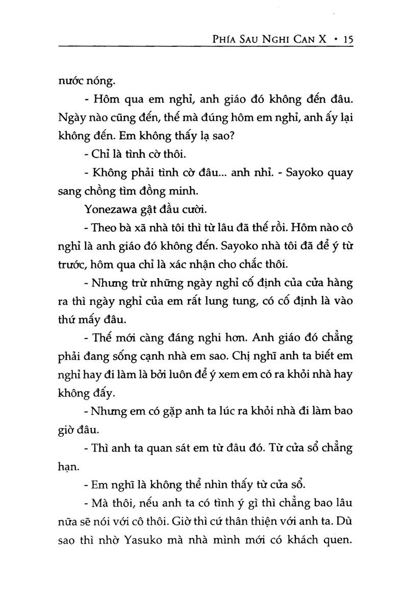 “Phía sau nghi can X gây hứng thú cho người đọc bởi nó khác rất nhiều so với những cuốn trinh thám thông thường. Thay vì tập trung miêu tả tội ác, cuốn tiểu thuyết chú trọng hơn vào con người, những mối quan hệ kỳ lạ và hoàn cảnh éo le của từng nhân vật. Càng thú vị hơn nữa, câu chuyện đầy tính nhân văn này lại được mô tả dưới góc nhìn đầy lý trí của toán học và vật lý.” - Sophia Lee – Phoenix Plume