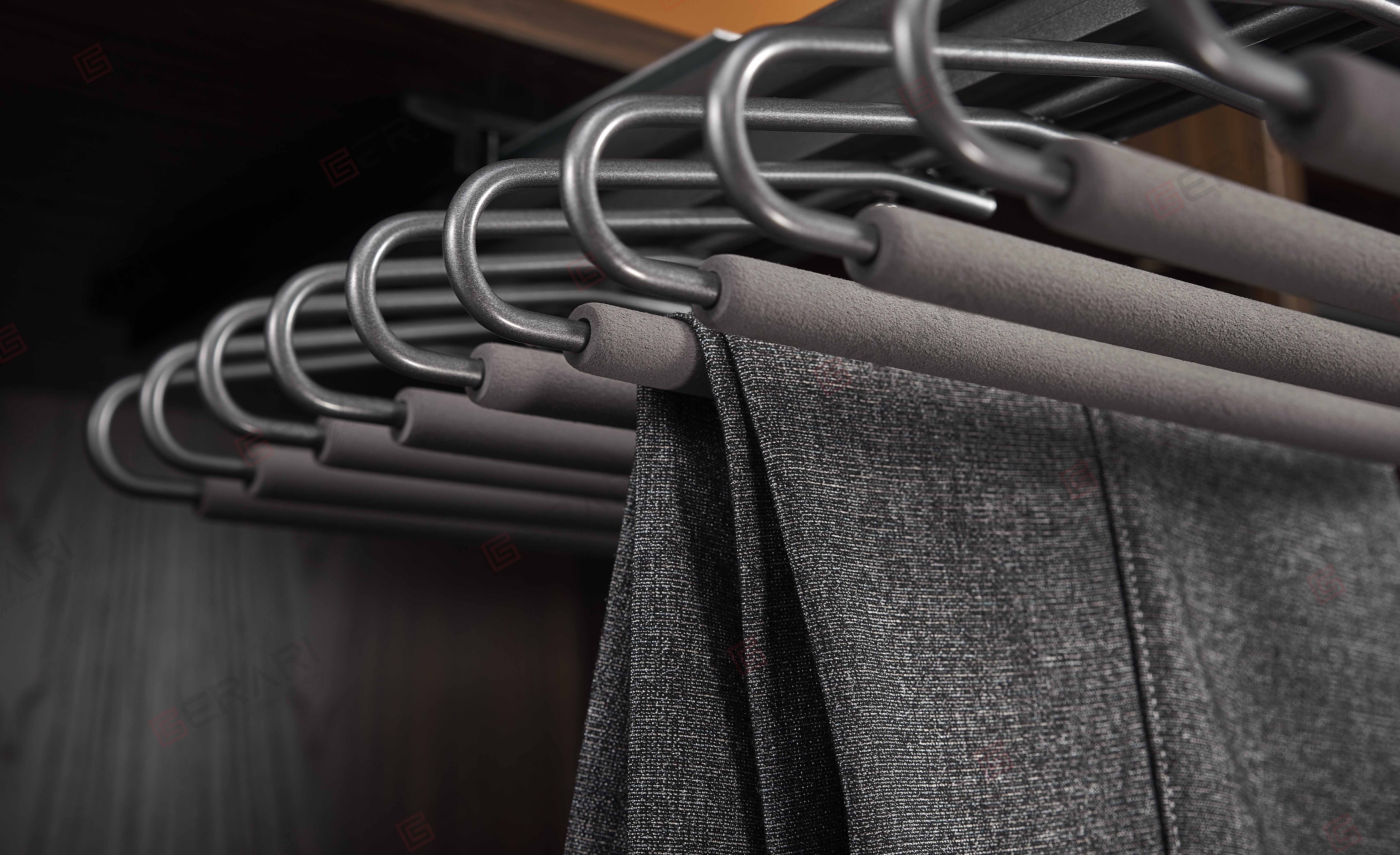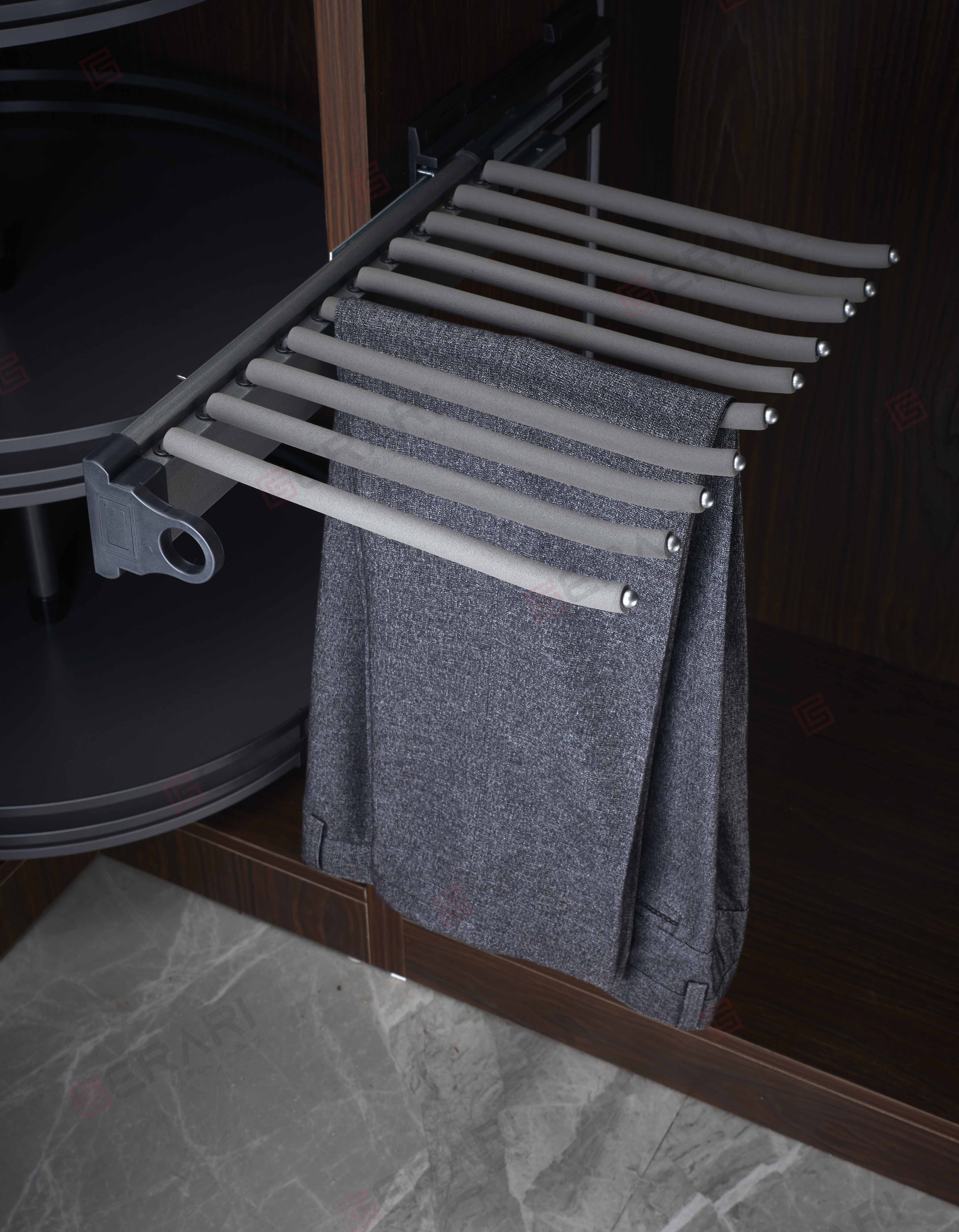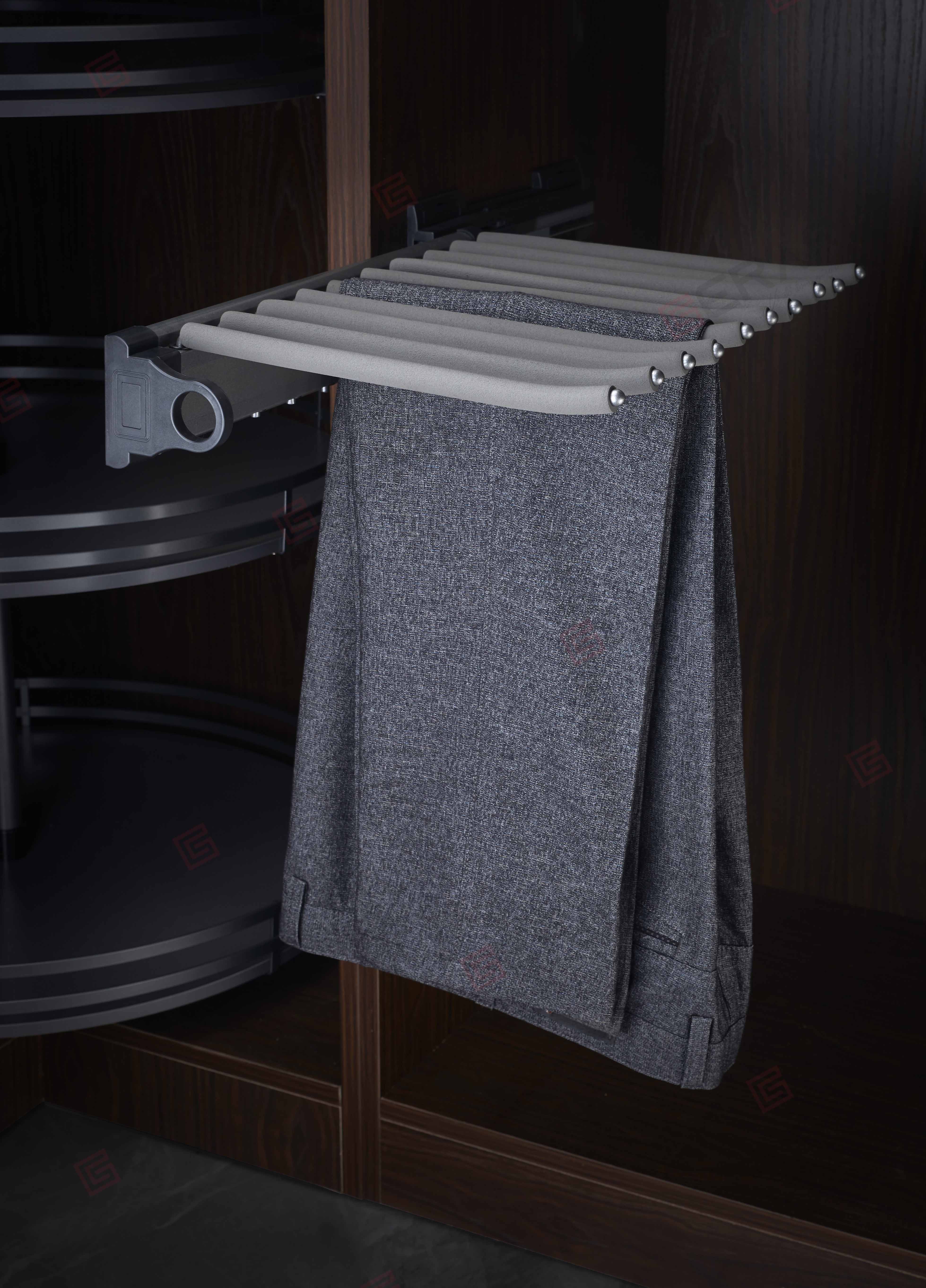 Phụ kiện của tủ áo - Giá treo quần âu âm tủ ray giảm chấn là bộ giá treo đa dụng được thiết kế tích hợp âm vào tủ quần áo với hệ ray trượt