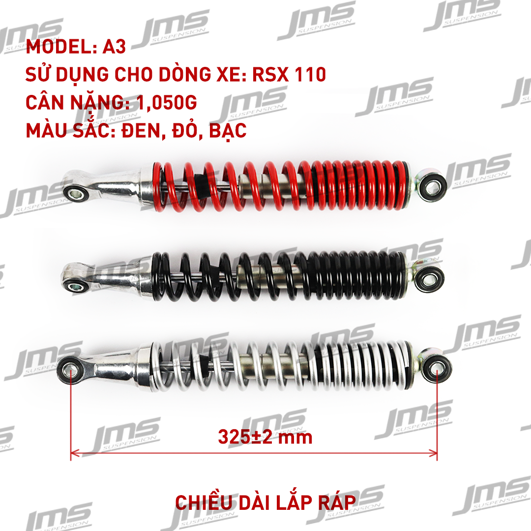 CHIỀU DÀI PHUỘC NHÚN: 325 mmXuất xứ: Công ty TNHH công nghệ JMSHàng mới 100%Dây chuyển sản xuất công nghệ Việt - NhậtCác tính năng nổi trội của Phuộc( giảm xóc) JMS:+ Trục piston được tôi cứng đế...