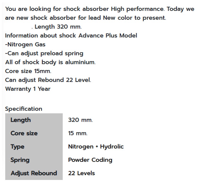 CHIỀU DÀI PHUỘC NHÚN: 325 mm Xuất xứ: Công ty TNHH công nghệ JMS Hàng mới 100% Dây chuyển sản xuất công nghệ Việt - Nhật Các tính năng nổi trội của Phuộc( giảm xóc)