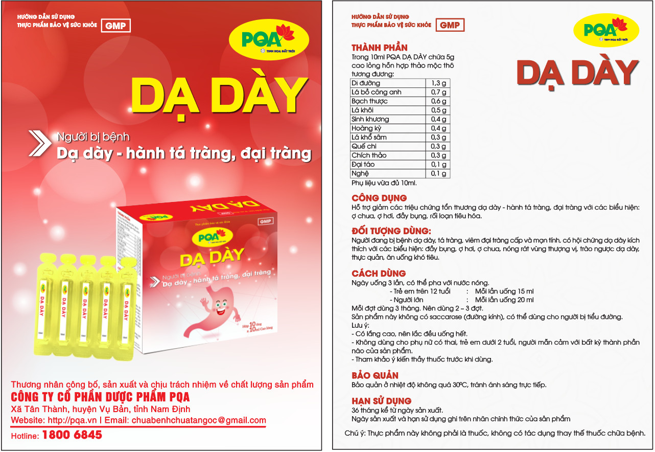 THÔNG TIN PQA DẠ DÀY DẠNG ỐNG PQA Dạ Dày dạng ống là dược phẩm thảo dược dùng cho người đang bị bệnh dạ dày, tá tràng, viêm đại tràng cấp và mãn tính hỗ trợ