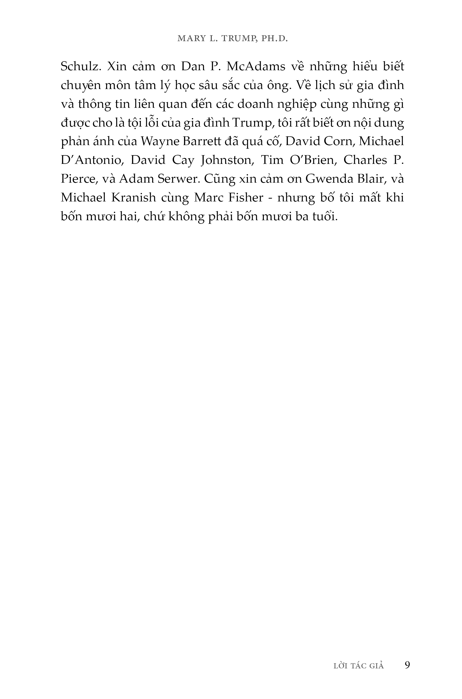 Đã có nhiều chuyên gia tâm lý, học giả và phóng viên tìm cách phân tích những thiếu xót chí mạng của Donald J. Trump. Nhưng Mary L. Trump lại có được nền tảng giáo dục, góc nhìn sâu sắc và sự thân thiết cần thiết để hé lộ những điều tạo nên con người của Tổng thống thứ 45 Hoa Kỳ - Donald Trump, cũng như các thành viên khác trong gia đình bà. Chỉ riêng bà là có thể kể lại câu chuyện hấp dẫn này, không chỉ bởi bà có cái nhìn của người trong cuộc, mà còn bởi bà là thành viên duy nhất trong nhà Trump sẵn lòng kể cho mọi người biết sự thật về một trong những gia đình quyền lực nhất thế giới nhưng cũng không kém phần rối loạn.