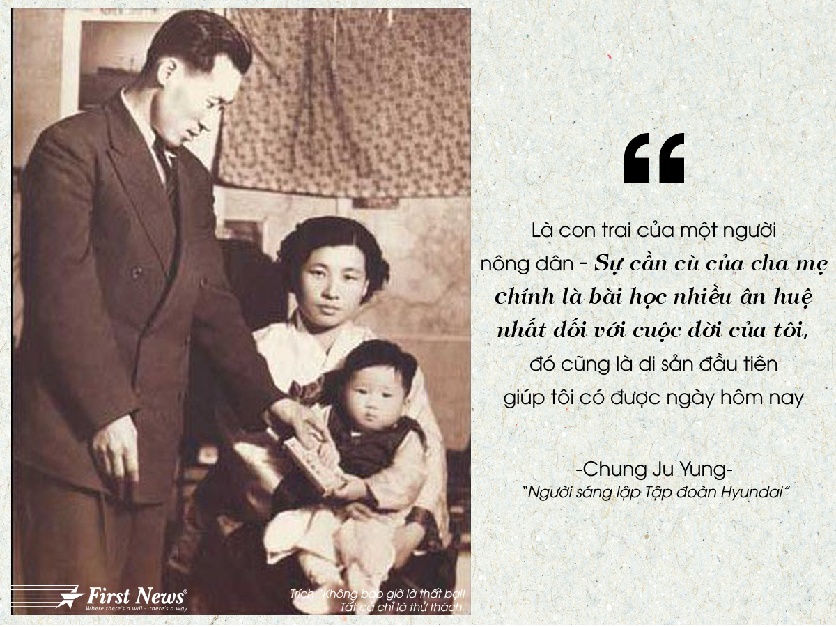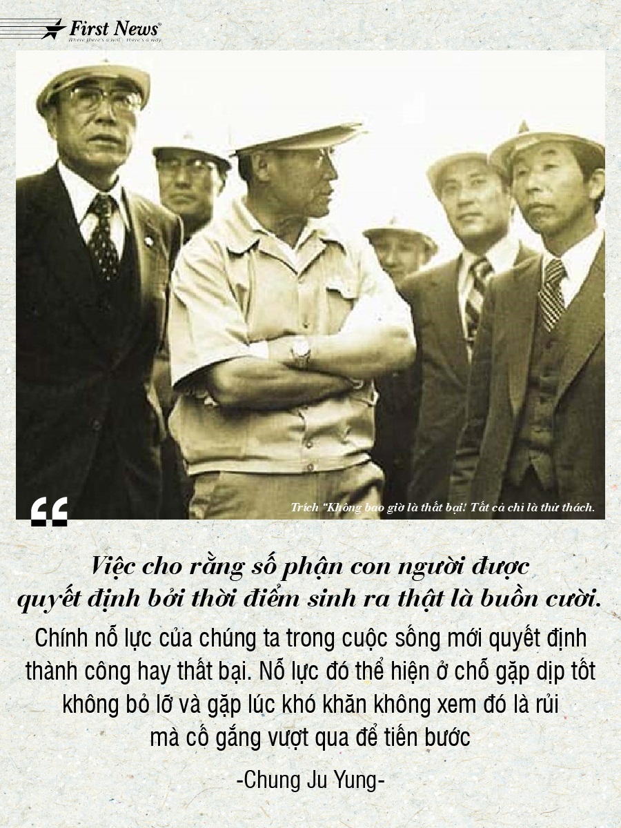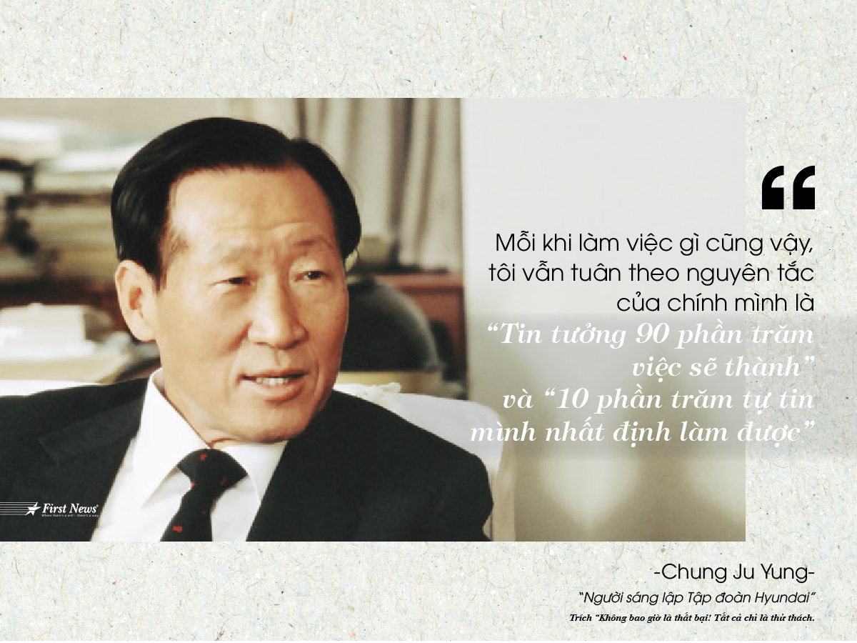 Tinh thần chiến đấu với những ngặt nghèo của số phận mà Chung Ju Yung tự trang bị cho mình không chỉ giúp ông chạm đến thành công mà còn trở thành cảm hứng cho rất nhiều thế hệ doanh nhân trẻ ở Hàn Quốc nói riêng, thế giới nói chung. Trong cuốn tự truyện của mình, ông viết: “Mọi thứ đều quân bình, vận may rủi đều đến với con người như nhau. Quan trọng nhất là phải nỗ lực, nỗ lực không ngừng và biết chớp thời cơ”. Với triết lý đó, Chung Ju Yung tin rằng thất bại hay không tùy thuộc vào định nghĩa của mỗi người.