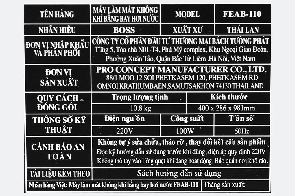Máy được cấu tạo bộ phận tạo ion giúp lọc sạch không khí, bụi bẩn và diệt vi khuẩn giúp bảo vệ sức khỏe người dùng Phạm vi làm mát thích hợp lên đến 15 - 20 m2 với công suất 100W Trang bị thang đo hiển thị mực nước, tiện quan sát mức nước trong bình. Dung tích bình chứa 15 lít, không cần châm nước nhiều lần trong ngày Dây đồng nguyên chất, cầu chì bảo vệ nhiệt cùng bo mạch phủ lớp chống ẩm, chống oxy hóa tăng độ bền cho máy. Khoang chứa nước có van xả cặn, an toàn khi sử dụng. Làm mát không khí với 3 chế độ gió, điều chỉnh linh hoạt cho nhu cầu sử dụng của người dùng Chức năng đảo gió 4 chiều, hướng gió xoay đều và tốc độ gió nhanh, giúp tăng khả năng làm mát nhanh. Có chế độ hẹn giờ tắt lên đến 8 tiếng giúp quá trình sử dụng trở nên nhanh chóng và tiết kiệm thời gian thao tác. Độ ồn không quá lớn ≤ 60 dB (tương đương độ ồn trong văn phòng), đảm bảo an toàn cho thính giác của gia đình bạn Quạt điều hòa Boss FEAB-110 thiết kế sang trọng, nhã nhặn, phù hợp với nhiều không gian trang trí  Quạt đa chức năng, sự kết hợp tối ưu giữa: Máy điều hòa - máy lọc không khí - máy quạt. Sử dụng remote để điều khiển tiện lợi hơn Dây điện dài 127 cm được cuộn gọn gàng phía sau máy. Lưu ý để sử dụng quạt điều hòa hiệu quả:
