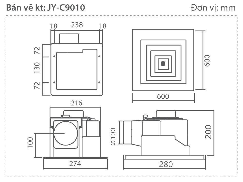 QUẠT THÔNG GIÓ ÂM TRẦN JY-C9010 - Model: JY-C9010 - Lưu lượng gió: 170m3/Hr - Công suất mô tơ: 24W - Kích thước lỗ khoét: 240x240mm - Kích thước mặt nạ: 600x600mm - Nguồn