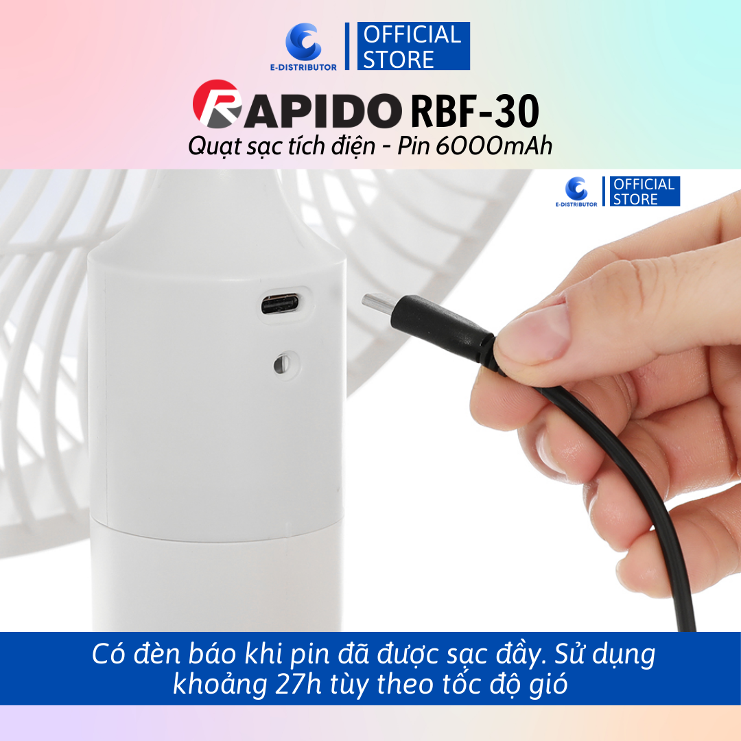 Quạt sạc điện có điều khiển Rapido RBF-30 (Pin 6000mAh) - 100% chính hãng 1. THÔNG SỐ KỸ THUẬT - Thương hiệu: Rapido - Thương hiệu của: Đức - Sản xuất tại: Việt Nam - Loại quạt: quạt sạc tích điện - quạt điều khiển (có remote) - Mã sản phẩm: RBF-30 - Điện áp: 220V - Công suất: 30W - Chế độ gió: Gió thường - Thời gian: + Thời gian sạc 6 giờ 45 phút + Thời gian sử dụng: lên đến 27 giờ - Bảng điều khiển:: Remote/Nút nhấn - Loại motor: Bạc đạn - Đường kính cánh quạt: 7 cánh - 30 cm - Chiều dài dây điện: 149 cm - Tiện ích: + Có remote + Hẹn giờ tắt + Điều chỉnh được chiều cao + Lồng quạt có khe hở nan quạt nhỏ + Có đèn báo khi sạc - Kích thước, khối lượng: Ngang 35 cm - Cao 79 - 109 cm - Sâu 35 cm - Nặng 5.5 kg - Bảo hành: 12 tháng về lỗi kỹ thuật 2. MÔ TẢ SẢN PHẨM - Ưu điểm sản phẩm: + Mẫu quạt sạc này sở hữu vẻ ngoài thời trang, màu trắng thanh lịch, thích hợp dùng trong không gian phòng diện tích nhỏ hoặc vừa: phòng ngủ, phòng đọc sách,... + Rapido RBF-30 có thể quay 180°, đưa gió lan tỏa nhiều hướng, làm mát hiệu quả. Bạn có thể điều chỉnh độ quay của quạt: 30°, 60°, 90°, 180°. + Có thể điều chỉnh độ cao quạt từ 79 cm đến 109 cm. + Lồng quạt có khe hở nan quạt nhỏ, đảm bảo an toàn khi sử dụng. + 7 cánh quạt đường kính 30 cm tạo làn gió mát trong phạm vi vừa và nhỏ. + Thời gian sạc khoảng 6 giờ 45 phút, sử dụng khoảng 27 giờ tùy theo tốc độ gió. - Quạt Rapido RBF-30 trang bị motor bạc đạn giúp quạt hoạt động bền bỉ, êm ái. - Công suất hoạt động 30W làm mát hiệu quả ở không gian vừa và nhỏ, tiết kiệm điện.