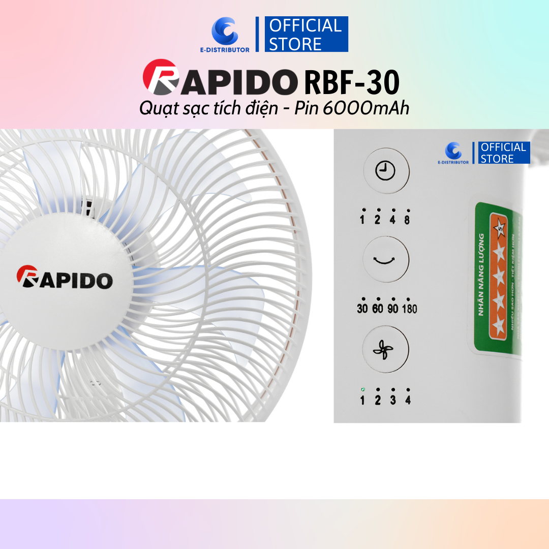 Quạt sạc điện có điều khiển Rapido RBF-30 (Pin 6000mAh) - 100% chính hãng1. THÔNG SỐ KỸ THUẬT- Thương hiệu: Rapido- Thương hiệu của: Đức- Sản xuất tại: Việt Nam- Loại quạt: quạt sạc tích điện -...