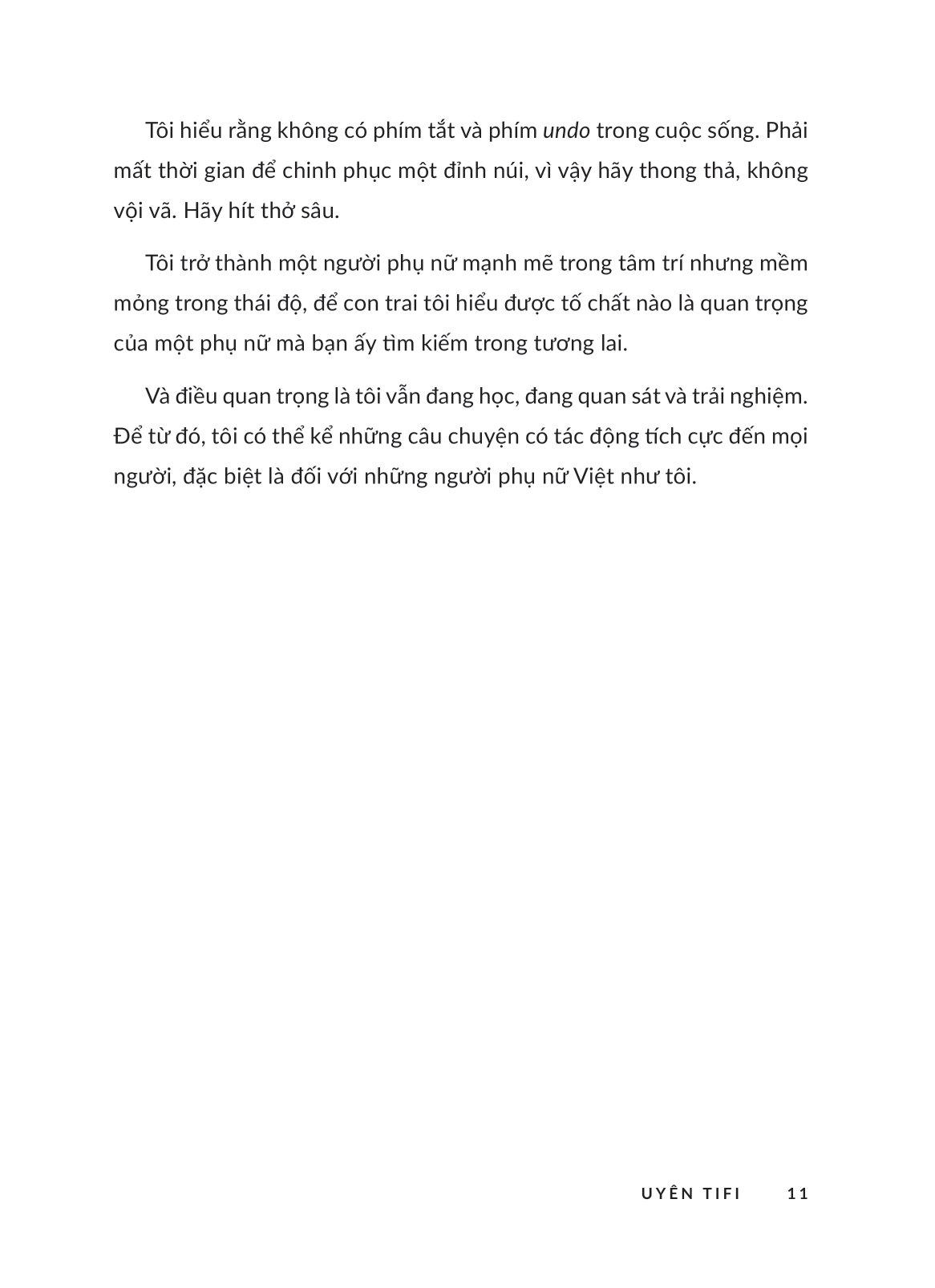 Tốt nghiệp Cao học tại Đại học Paris Créteil (Pháp), tác giả Uyên Tifi từng đảm nhiệm nhiều vị trí quản lý cấp cao trước khi định cư tại Thụy Điển năm 2018. Hiện tại cô không chỉ kinh doanh dịch vụ tư vấn, kết nối thương mại, khởi nghiệp và ươm tạo doanh nghiệp mà còn tạo ra những kết nối giá trị đồng thời truyền cảm hứng sống hạnh phúc cho phụ nữ.