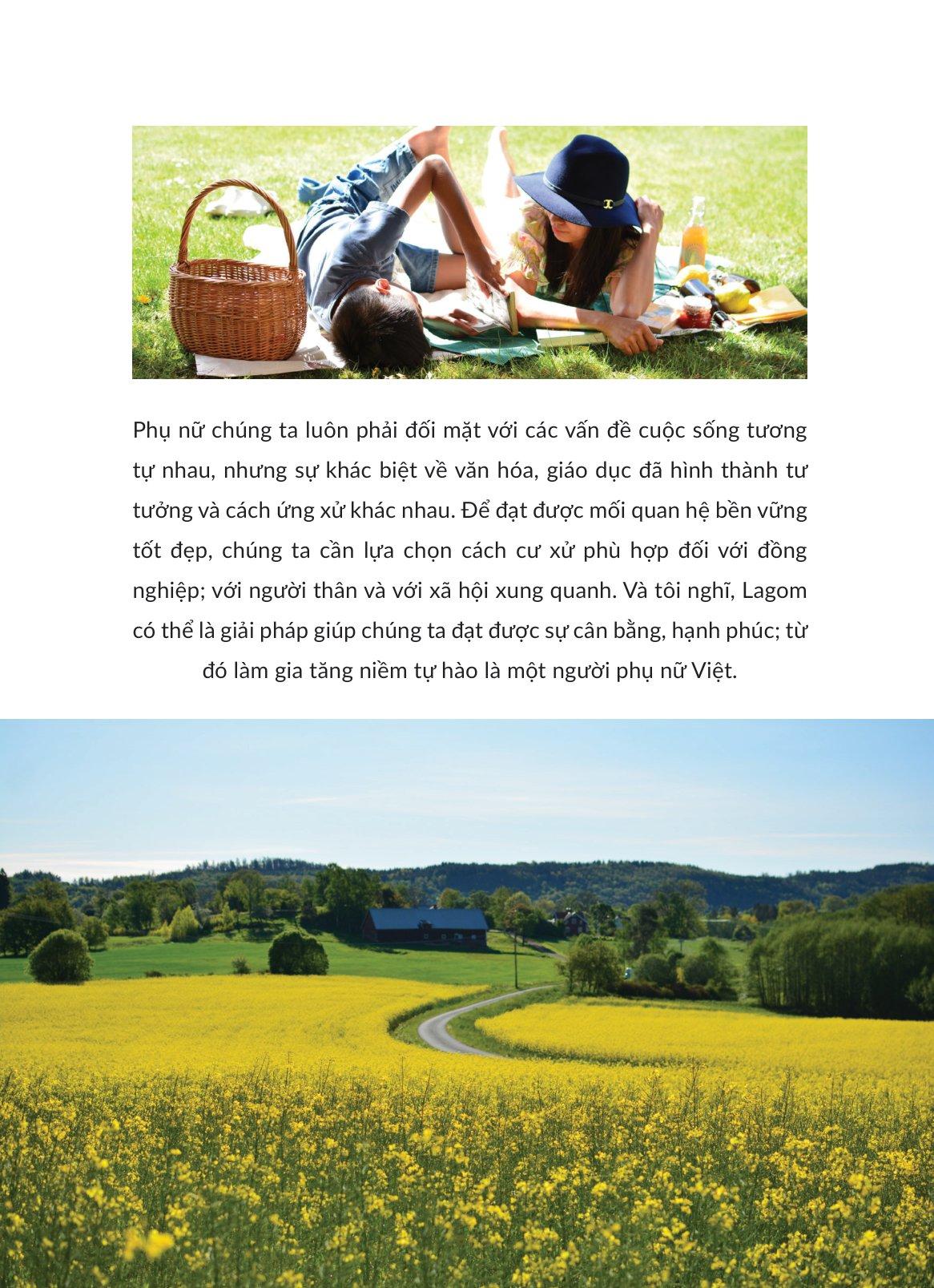 Dù bạn đã từng nghe đến hay còn xa lạ với Lagom thì cuốn sách này vẫn hứa hẹn đem đến cho bạn một góc nhìn rất khác về phong cách sống của người Bắc Âu - nơi được mệnh danh là “Vương quốc Hạnh phúc”. Theo chân hành trình sống, quan sát và chiêm nghiệm của tác giả Uyên Tifi cùng những người bản xứ, cuốn sách đi từ những khái niệm cơ bản nhất của Lagom đến việc ứng dụng triết lý này để đạt được sự cân bằng viên mãn thông qua 7 khía cạnh tiêu biểu: xây dựng sự nghiệp, in dấu cá nhân qua thời trang, chế độ ăn uống lành mạnh, gìn giữ hạnh phúc gia đình, rèn luyện thể chất và tinh thần, quản lý tài chính và bảo vệ môi trường bền vững.