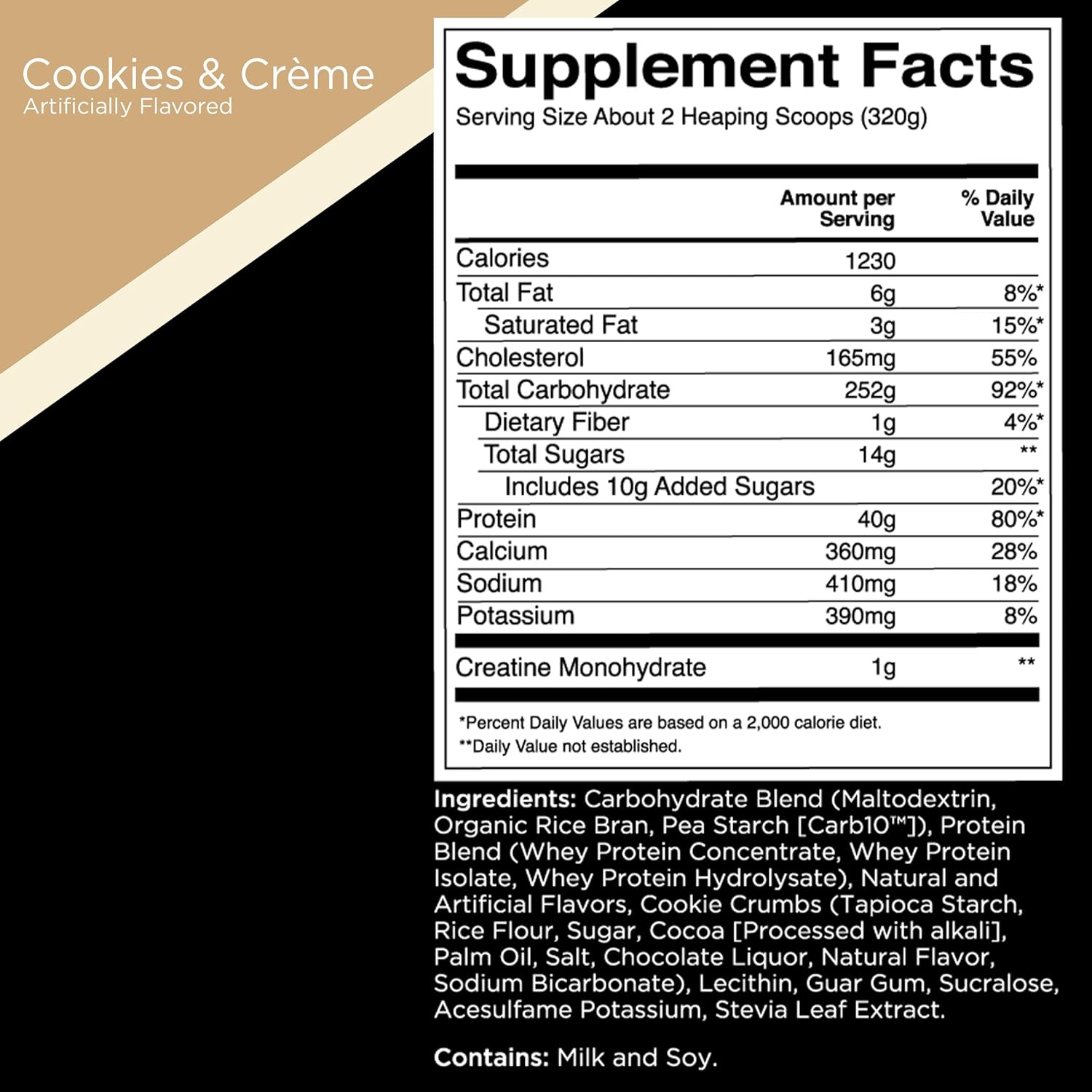 - Với hơn 1,200 calorie, hơn 250g carb và 40g protein từ 3 loại whey, R1 Mass Gainer giúp bạn tăng khối lượng cơ bắp XXL. Bên cạnh tỉ lệ carb trên protein là 6:1, công thức giàu calo bao gồm creatine, MCTs, và glutamine giúp bạn đạt được hình thể mong muốn