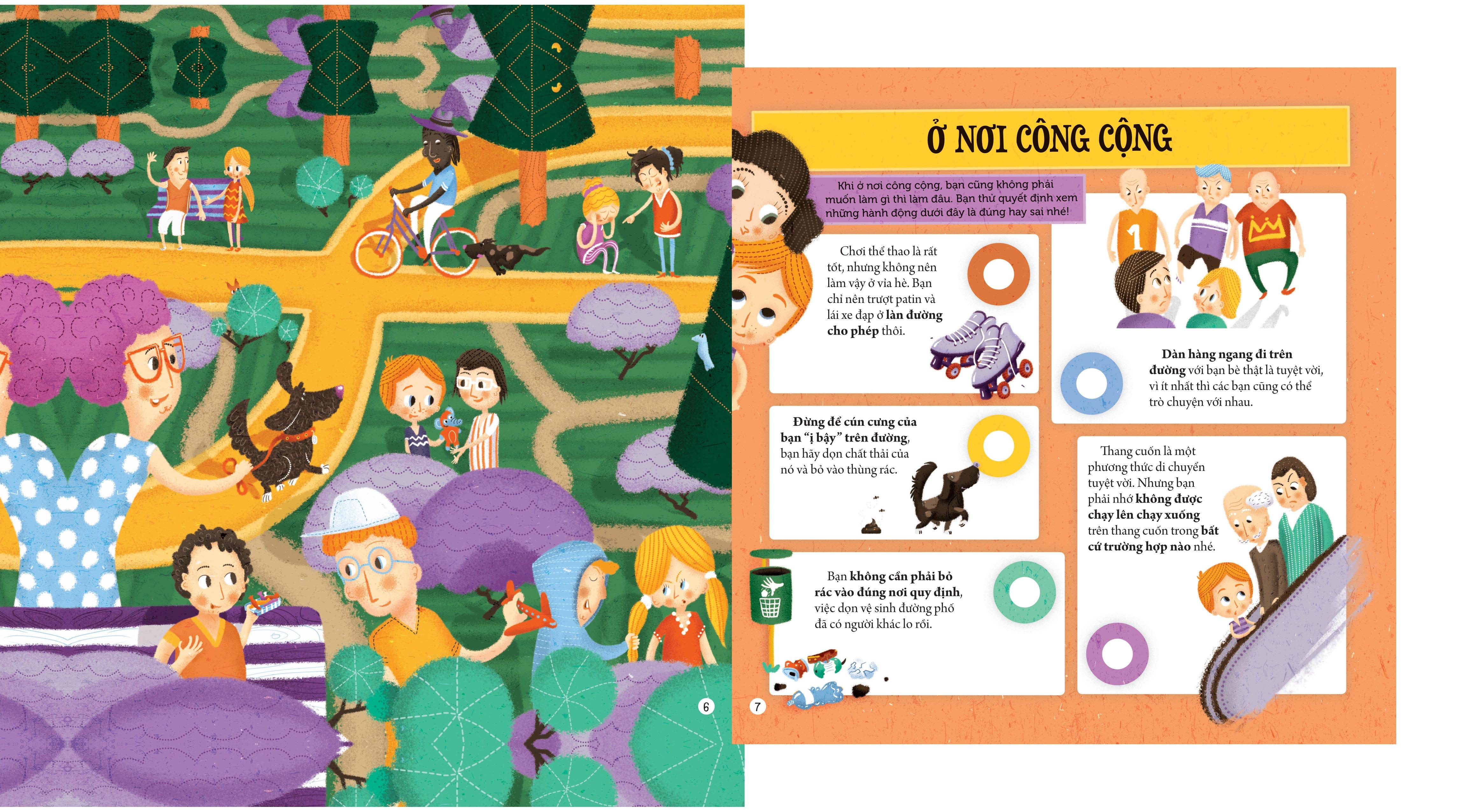 Mỗi chủ điểm có từ 5 - 10 câu hỏi tình huống thực tế, khuyến khích trẻ tư duy và đưa ra quyết định chọn Đúng hay Sai. Sau đó trẻ sẽ “Kéo” thanh kéo trong sách và sẽ tìm thấy đáp án chính xác cho mỗi câu hỏi. Qua từng chủ điểm trẻ sẽ được giới thiệu các bài học về cách ứng xử văn minh với chính m.ình, bạn bè, thầy cô, biết nói lời chào, xin lỗi, cảm ơn…