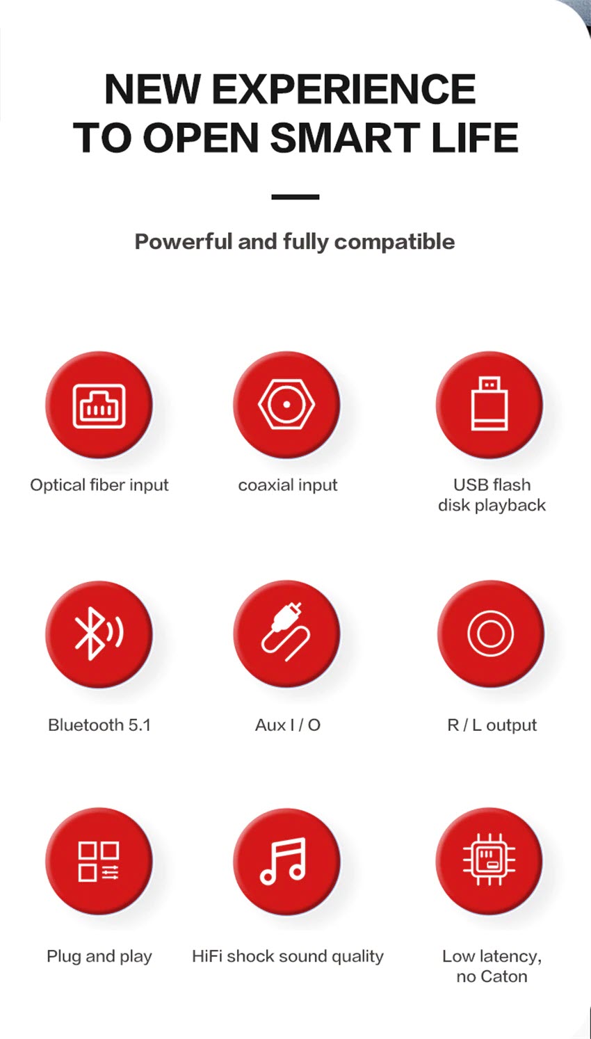 - Hỗ trợ đa dạng kết nối: T01 cung cấp nhiều lựa chọn kết nối để đáp ứng nhu cầu của bạn: Bluetooth 5.1, Optical (Toslink), Coaxial, AUX 3.5mm và USB (đọc đĩa U).