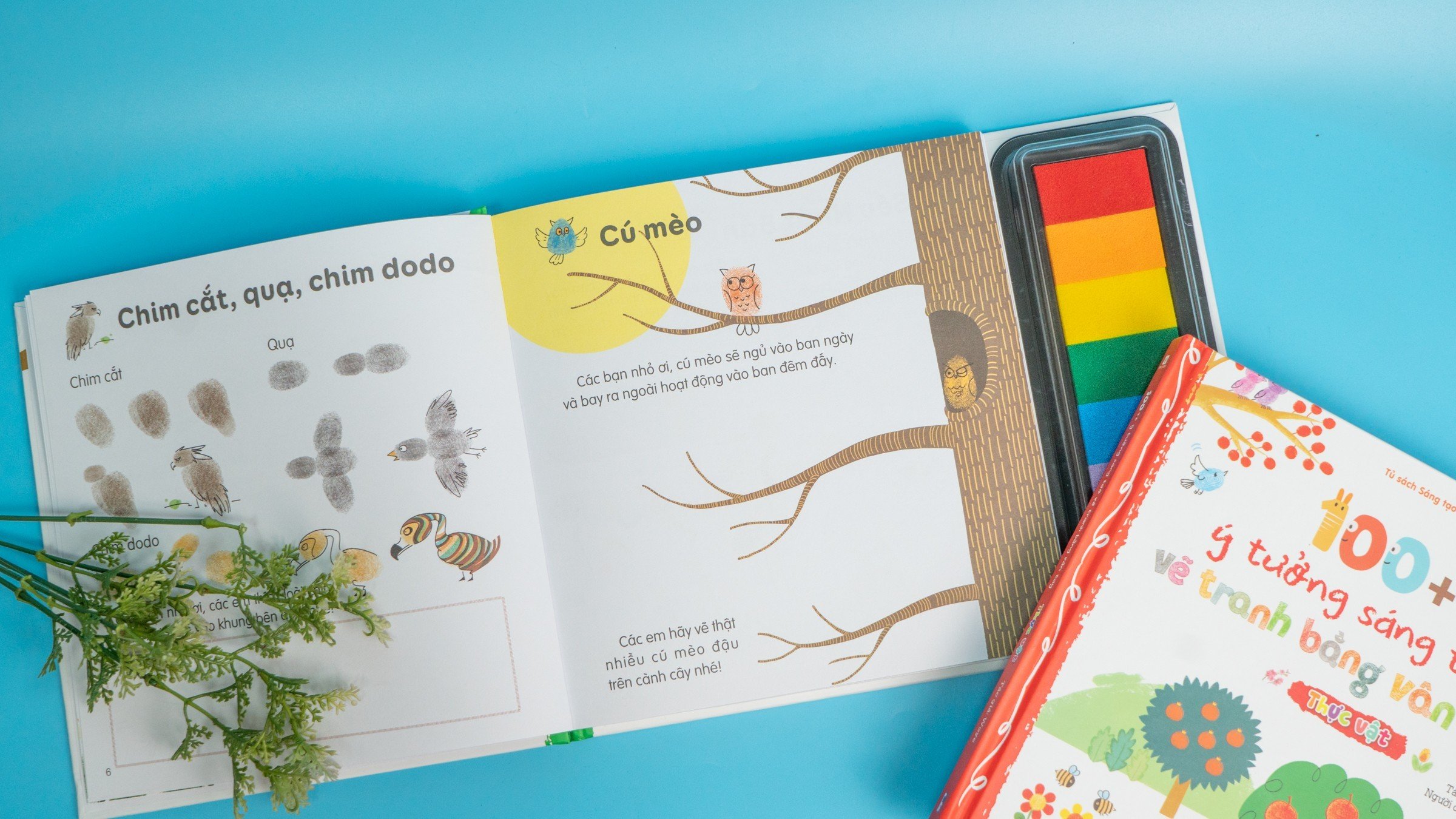 Với bộ sách 100++ ý tưởng sáng tạo vẽ tranh bằng vân tay, mỗi ngón tay xinh của các em sẽ là một “cây cọ vẽ” để sáng tạo nên cả thế giới mà chẳng cần đến những nguyên vật liệu lỉnh kỉnh. Cũng chẳng đòi hỏi các “họa sĩ nhí” phải quá khéo tay, chỉ cần các thao tác vô cùng đơn giản, thêm họa tiết, thêm màu sắc, thế là các loài động vật đáng yêu như gà, vịt, cú mèo, voi, cá… hay các loài thực vật quen thuộc như táo, nho, dâu tây, bắp cải, hoa hồng, hoa sen… đã hiện ra hết sức sống động rồi đấy!