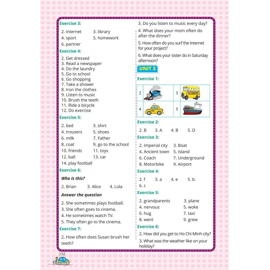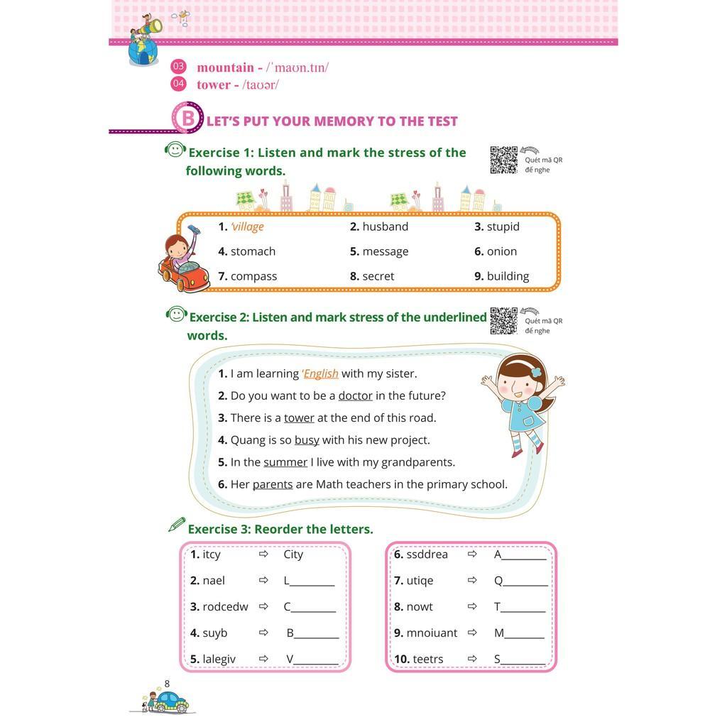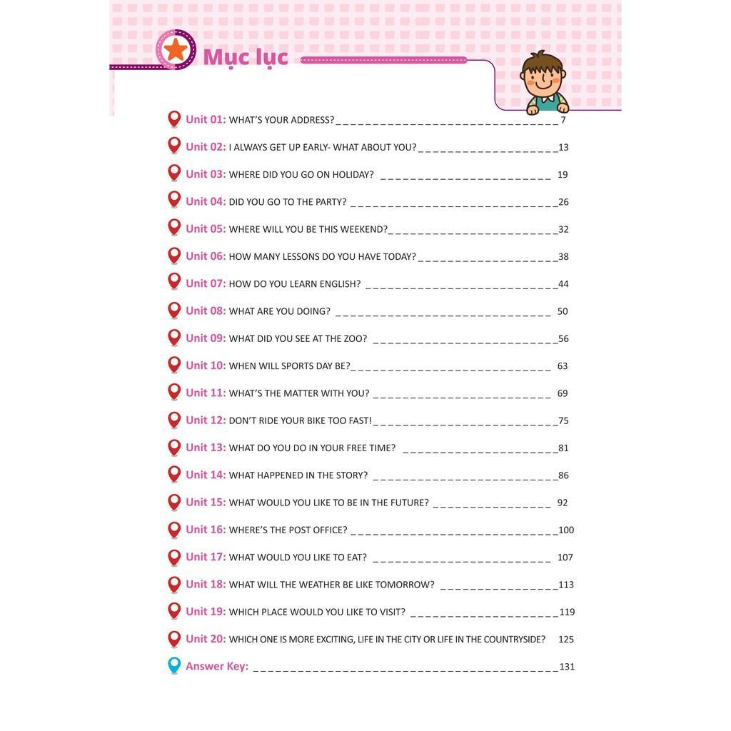 - Cấu trúc bài học chặt chẽ – Ôn tập toàn diện, ghi nhớ nhanh A. Kiến thức cần nhớ – What you need to remember Phần lý thuyết ngắn gọn, giúp các em ôn tập toàn bộ kiến thức từ vựng, cấu trúc và ngữ âm theo mỗi unit trên lớp B. Bài kiểm tra tổng hợp – Let’s put your memory to the test Bài kiểm tra tổng hợp các dạng bài tập thực hành: Trắc nghiệm chọn câu đúng, nghe và điền từ, tìm lỗi sai, nối, hoàn thành câu… C. Đáp án – Answer key Đáp án và lời giải chi tiết cuối sách giúp các em tự đánh giá lại mức độ thông hiểu và ghi nhớ, khắc sâu thêm kiến thức