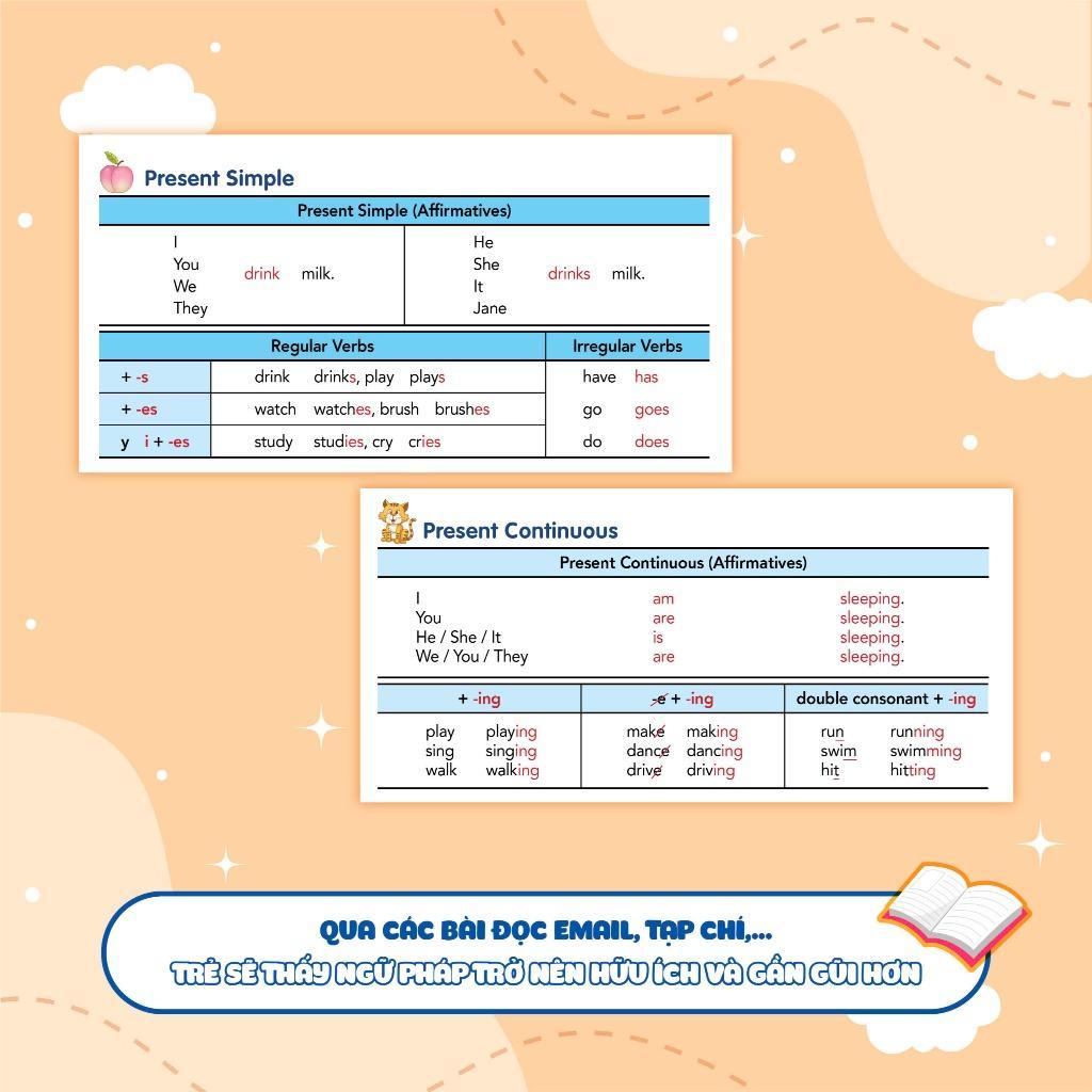 - Phần ngữ pháp đọc hiểu cung cấp các bài đọc (email, tạp chí, thư,…) giúp các con áp dụng ngữ pháp vào trong từng ngữ cảnh và củng cố kiến thức đã học. Điều này cũng giúp các bài học trở nên sinh động và thú vị hơn.