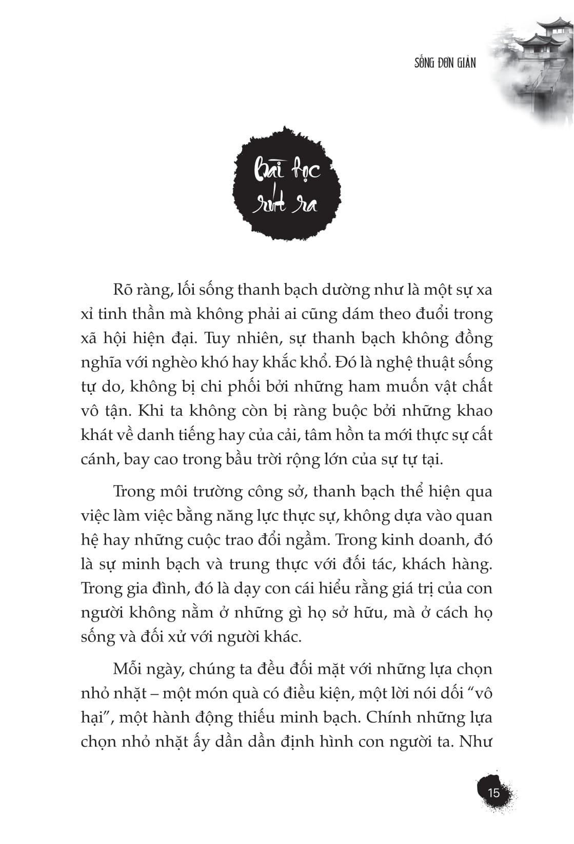 Mua tại TiktokBách Trí Minh Đạo - Sống Đơn Giản - Cội Nguồn Của Tâm An Tác phẩm Sống đơn giản - Cội nguồn của tâm an hiện ra như dòng suối mát lành, xoa dịu những tâm hồn khao khát bình yên. Từng trang giấy đưa người đọc vào cuộc hành trình khai phá bản chất tinh túy của sự đơn giản - vượt xa khỏi ý niệm về sự thiếu thốn hay nghèo nàn, tiến đến nghệ thuật tinh tế của sự lựa chọn, buông bỏ và trân trọng hiện hữu. Triết lý thâm sâu được chuyển tải qua ngôn từ giản dị mà đầy quyền năng, gieo vào tâm trí người đọc những hạt mầm quý giá, âm thầm đơm hoa kết trái qua từng ngày. Nội dung cuốn sách Sống đơn giản - Cội nguồn của tâm an Qua từng chương sách, tác giả khéo léo dẫn dắt người đọc vào những khám phá sâu sắc: