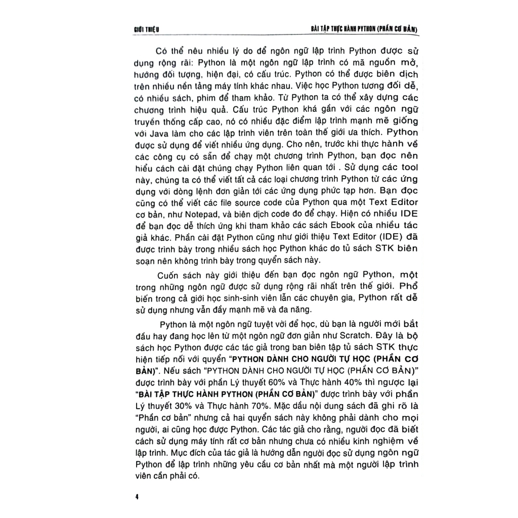 Cuốn sách này giới thiệu đến bạn đọc ngôn ngữ Python, một trong những ngôn ngữ được sử dụng rộng rãi nhất trên thế giới. Phổ biến trong cả giới học sinh-sinh viên lẫn các chuyên gia, Python rất dễ sử dụng nhưng vẫn đầy mạnh mẽ và đa năng. Python là một ngôn ngữ tuyệt vời để học, dù bạn là người mới bắt đầu hay đang học lên từ một ngôn ngữ đơn giản như Scratch. Đây là bộ sách học Python thực hiện tiếp nối với quyển “PYTHON DÀNH CHO NGƯỜI TỰ HỌC (PHẦN CƠ BẢN)”. Nếu sách “PYTHON DÀNH CHO NGƯỜI TỰ HỌC (PHẦN CƠ BẢN)” được trình bày với phần Lý thuyết 60% và Thực hành 40% thì ngược lại “BÀI TẬP THỰC HÀNH PYTHON (PHẦN CƠ BẢN)” được trình bày với phần Lý thuyết 30% và Thực hành 70%. Mặc dầu nội dung sách đã ghi rõ là “Phần cơ bản” nhưng cả hai quyển sách này không phải dành cho mọi người, ai cũng học được Python. Các tác giả cho rằng, người đọc đã biết cách sử dụng máy tính rất cơ bản nhưng chưa có nhiều kinh nghiệm về lập trình. Mục đích của tác giả là hướng dẫn người đọc sử dụng ngôn ngữ Python để lập trình những yêu cầu cơ bản nhất mà một người lập trình viên cần phải có.
