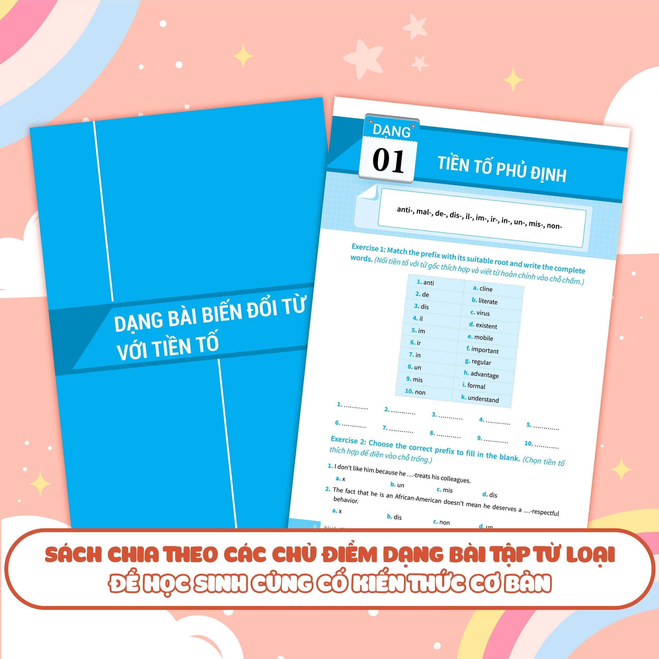 Sách còn bổ sung các dạng bài tập tổng hợp về từ loại thường gặp nhất, 100% xuất hiện trong đề thi