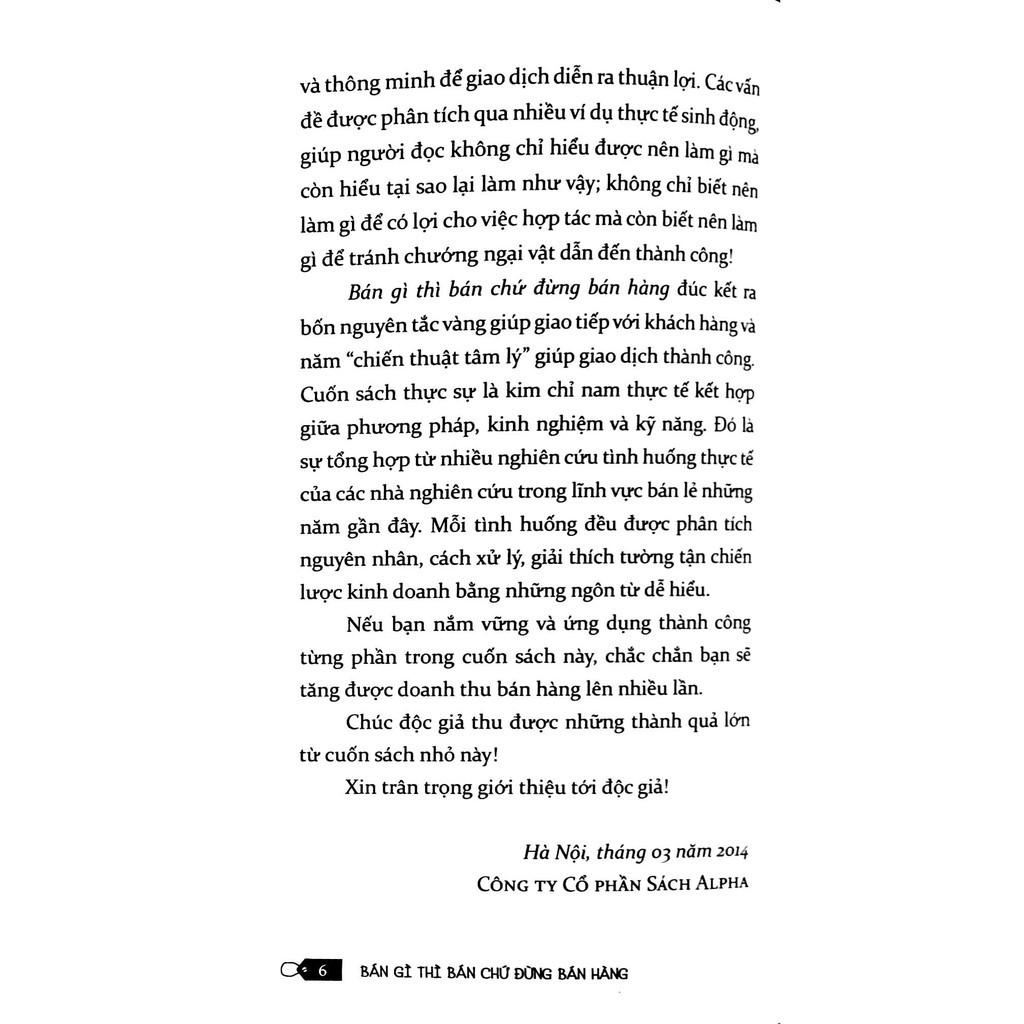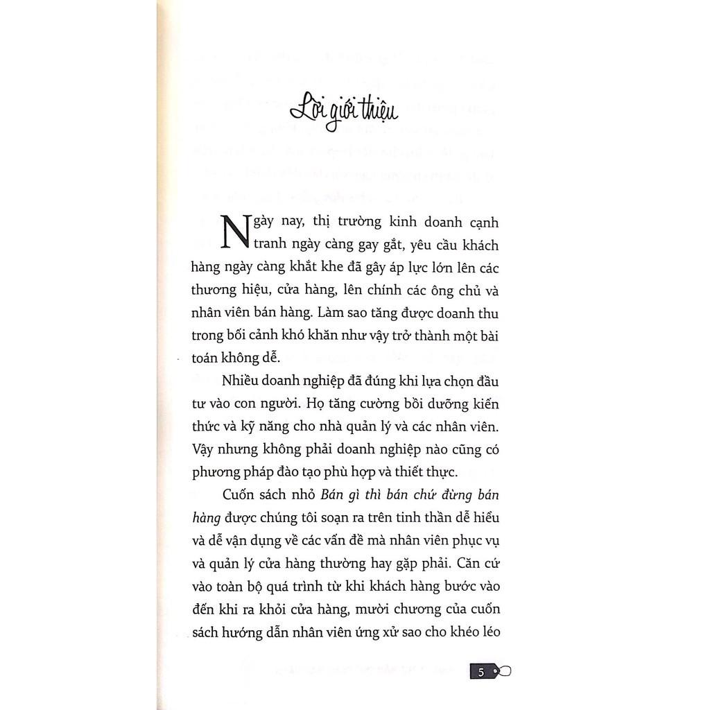 Mua tại TiktokCuốn sách nhỏ Bán gì thì bán chứ đừng bán hàng sẽ là cuốn cẩm nang kinh doanh hướng đến các vấn đề mà nhân viên phục vụ và quản lý cửa hàng thường gặp phải. Cuốn sách được soạn ra trên tinh thần dễ hiểu và dễ vận dụng, bám sát vào quá trình từ khi khách hàng bước vào đến khi ra khỏi cửa hàng.