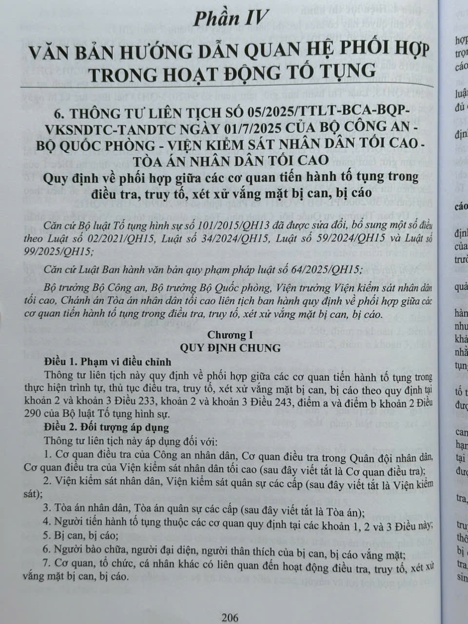 – Thông tư liên tịch 05/2025/TTLT-BCA-BQP-VKSNDTC-TANDTC ngày 01/7/2025 Quy định về phối hợp giữa các cơ quan tiến hành tố tụng trong điều tra, truy tố, xét xử vắng mặt bị can, bị cáo;