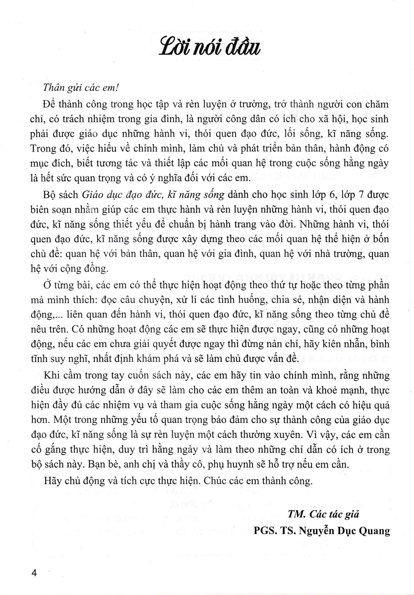 Khi cầm trong tay cuốn sách này, các em hãy tin vào chính mình, rằng những điều được hướng dẫn ở đây sẽ làm cho các em thêm an toàn và khoẻ mạnh, thực hiện đầy đủ các nhiệm vụ và tham gia cuộc sống hằng ngày một cách có hiệu quả hơn. Một trong những yếu tố quan trọng bảo đảm cho sự thành công của giáo dục đạo đức, kĩ năng sống là sự rèn luyện một cách thường xuyên. Vì vậy, các em cần cố gắng thực hiện, duy trì hằng ngày và làm theo những chỉ dẫn có ích ở trong bộ sách này. Bạn bè, anh chị và thầy cô, phụ huynh sẽ hỗ trợ nếu em cần.