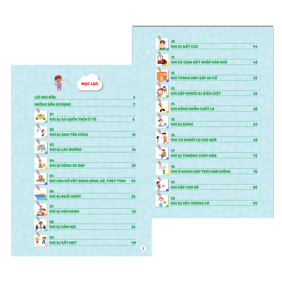 Mua tại TiktokSách "Cẩm nang hướng dẫn trẻ xử lý tình huống khi gặp nạn" Mục đích cuốn sách Với 20 tình huống này con sẽ biết cách tự bảo vệ mình và xử lý tốt những tình huống khác trong cuộc sống. Sách cẩm nang sẽ trở thành người bạn thân thiết với các bạn học sinh trong độ tuổi từ 4-10 tuổi Nội dung cuốn sách Cuốn sách đưa ra các tình huống nguy hiểm thường gặp trong cuộc sống của trẻ cùng với giải pháp xử lý tối ưu thể hiện qua sơ đồ MINDMAP. Trong sơ đồ, các hướng xử lý tối ưu được đánh số thứ tự theo mức độ ưu tiên, hướng xử lý không đúng sẽ có phần ghi chú hậu quả gặp phải. Mỗi tình huống được thiết kế sinh động với các hình ảnh, màu sắc trực quan, dễ hiểu. Sau mỗi tình huống là phần bài tập củng cố với nhiều dạng bài phong phú giúp trẻ ghi nhớ các hướng giải quyết một cách nhanh chóng. Sách cẩm nang với 20 tình huống bao gồm:
