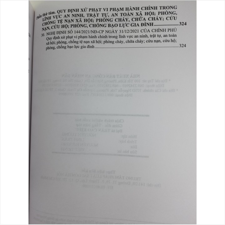 - Thông tư số 06/2022/TT-BCA ngày 17/01/2022 Quy định quy trình thực hiện nhiệm vụ công tác phòng cháy, chữa cháy, cứu nạn, cứu hộ trong Công an nhân dân; - Nghị định 144/2021/NĐ-CP ngày 31/12/2021 Quy định xử phạt vi phạm hành chính trong lĩnh vực an ninh, trật tự, an toàn xã hội; phòng, chống tệ nạn xã hội; phòng cháy, chữa cháy; cứu nạn, cứu hộ; phòng, chống bạo lực gia đình… Nhằm phổ biến đến Quý Cơ quan, Đơn vị và Quý khách hàng thân thiết nắm bắt kịp thời những quy định mới nêu trên. Nhà sách Nam Việt xin trân trọng giới thiệu cuốn sách: Sách CẨM NANG PHÁP LUẬT DÀNH CHO NGÀNH CÔNG AN NHÂN DÂN Nội dung sách gồm 8 phần: Phần thứ nhất. Tìm hiểu LUẬT CÔNG AN NHÂN DÂN VÀ CÁC VĂN BẢN HƯỚNG DẪN THI HÀNH Phần thứ hai. QUY ĐỊNH MỚI VỀ THANH TRA, GIẢI QUYẾT KHIẾU NẠI, TỐ CÁO VÀ TIẾP CÔNG DÂN TRONG CÔNG AN NHÂN DÂN Phần thứ ba. QUY ĐỊNH VỀ NHIỆM VỤ CÔNG TÁC PHÒNG CHÁY, CHỮA CHÁY, CỨU NẠN, CỨU HỘ, ỨNG PHÓ SỰ CỐ, THIÊN TAI TRONG CÔNG AN NHÂN DÂN Phần thứ tư. QUY ĐỊNH VỀ PHỐI HỢP VỚI CÁC CƠ QUAN CÓ THẨM QUYỀN TRONG GIẢI QUYẾT TỐ GIÁC, TIN BÁO VỀ TỘI PHẠM, KIẾN NGHỊ KHỞI TỐ, XÉT XỬ, CHẤP HÀNH ÁN PHẠT TÙ Phần thứ năm. QUY ĐỊNH ĐIỀU CHỈNH MỨC TRỢ CẤP HẰNG THÁNG ĐỐI VỚI CÁN BỘ CÔNG AN Phần thứ sáu. Tìm hiểu LUẬT CƯ TRÚ VÀ MỘT SỐ BIỆN PHÁP THI HÀNH LUẬT CƯ TRÚ Phần thứ bảy. Tìm hiểu LUẬT CẢNH SÁT CƠ ĐỘNG Phần thứ tám. QUY ĐỊNH MỚI VỀ XỬ PHẠT VI PHẠM HÀNH CHÍNH TRONG LĨNH VỰC AN NINH, TRẬT TỰ, AN TOÀN XÃ HỘI; PHÒNG, CHỐNG TỆ NẠN XÃ HỘI; PHÒNG CHÁY, CHỮA CHÁY; CỨU NẠN, CỨU HỘ; PHÒNG, CHỐNG BẠO LỰC GIA ĐÌNH Cảm ơn các bạn đã ghé thăm shop Nhà sách Nam Việt ! CẨM NANG PHÁP LUẬT DÀNH CHO NGÀNH CÔNG AN NHÂN DÂN CẨM NANG PHÁP LUẬT DÀNH CHO NGÀNH CÔNG AN NHÂN DÂN