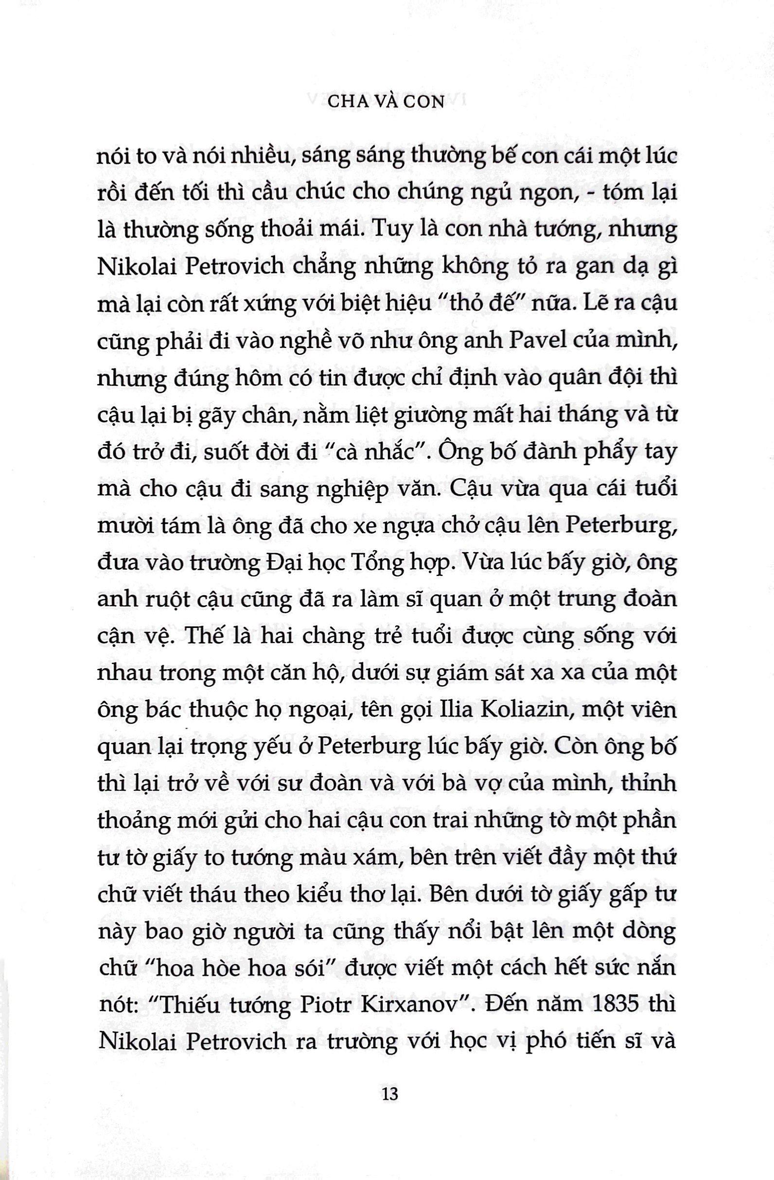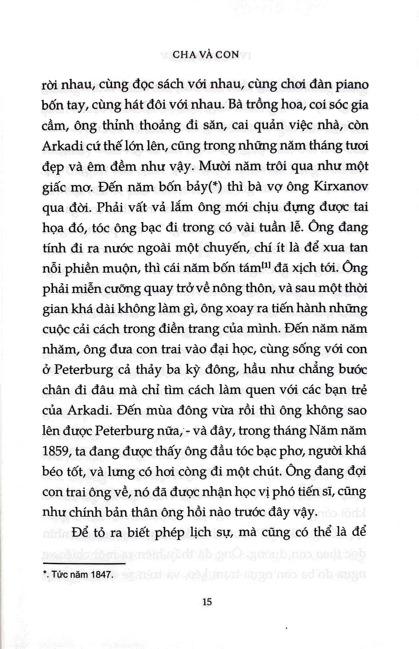 Khi Arkadi, chàng sinh viên mới tốt nghiệp về nhà, cha và ông bác quý tộc của cậu đã khó chịu xiết bao với một người bạn lạ hoắc đi theo. Đó là Bazarov, kẻ nổi loạn, kẻ dám “không thừa nhận bất cứ quyền uy nào, cũng như chẳng chấp nhận một nhân tố nhỏ nhoi nào về đức tin”. Kiệt tác của Turgenev về xung đột giữa các thế hệ đã làm nước Nga bị sốc khi xuất bản lần thứ nhất vào năm 1862 và ngày nay vẫn còn nguyên sự tươi mới, trực tiếp, kích động như đã luôn như vậy với những độc giả lần đầu chạm trán mẫu nhân vật hư vô nổi tiếng của nó.